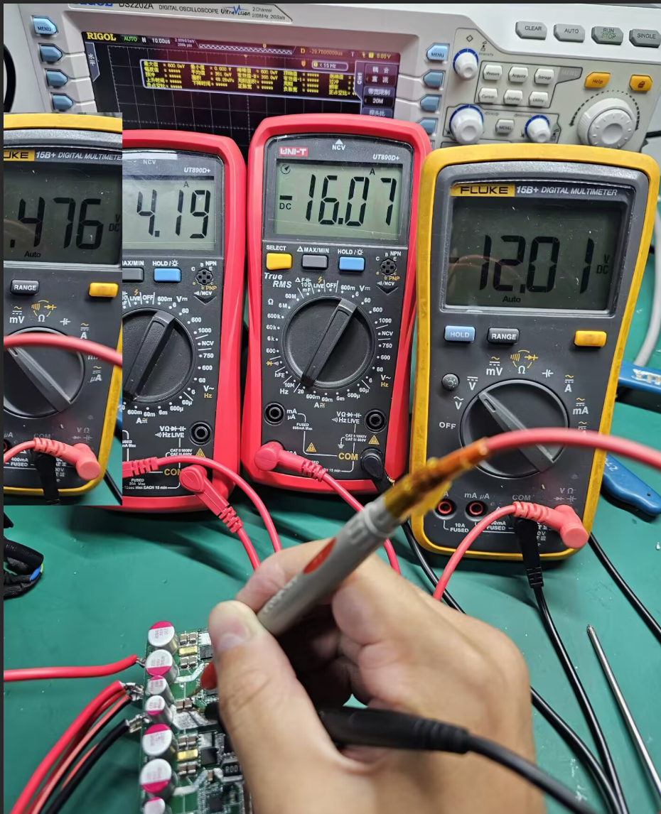 测试1A轻载与20A满载情况下的转换效率,万用表有限,电压值分两次测试贴图展示,电流只能测到16A超过烧保险丝了。