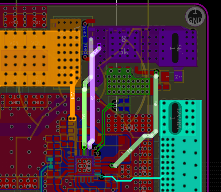 栅极驱动与SW走线是dv/dt di/dt最大、噪声最剧烈的关键节点,电流大频率高,走线不好的话会提升寄生电容与阻抗导致波形参数高频振铃造成开关管导通/管断不及时提升开关损耗。