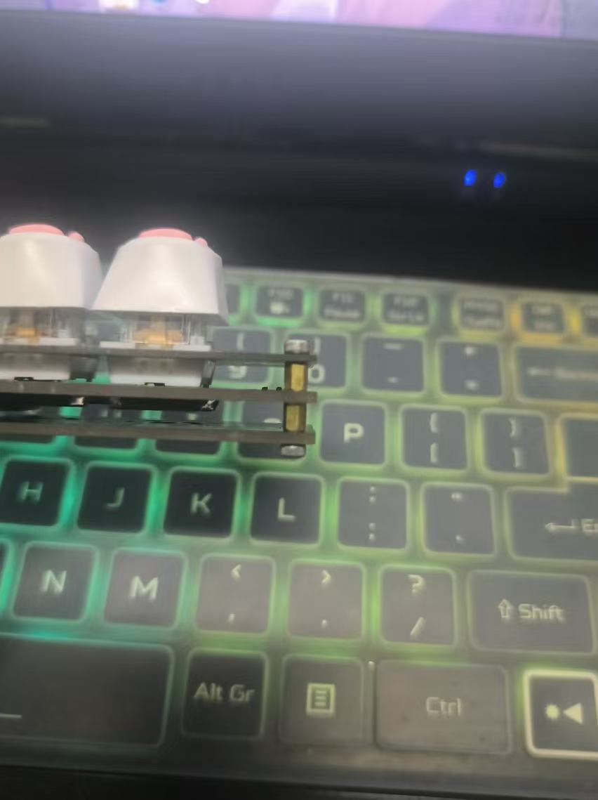 至上而下分别是螺丝,双通铜柱,单通铜柱螺丝。顶层板厚(定位板)一毫米,其他板厚1.6毫米。这样可以 刚好卡住 机械键轴,使其不会前后左右移动,仍可以拔插,如此固定已经非常稳,如果你想要机械建筑稳稳的卡在面板上 那么原来设计预留的是1.6毫米,也就是你要采用1.6毫米的顶层定位板,同时铜柱长度要做调整,确保中央层的上表面到顶层定位板上表面的距离是5个毫米。