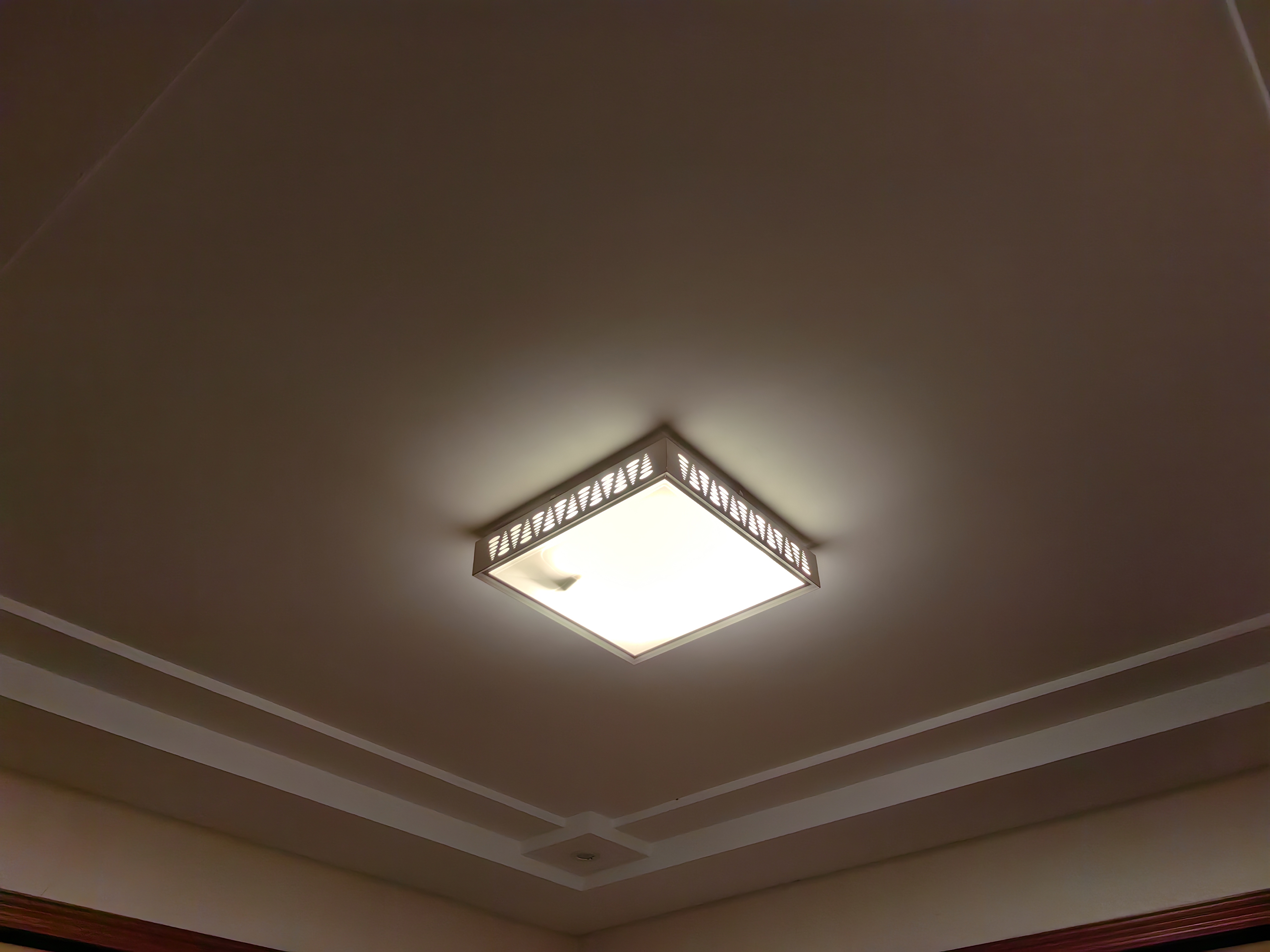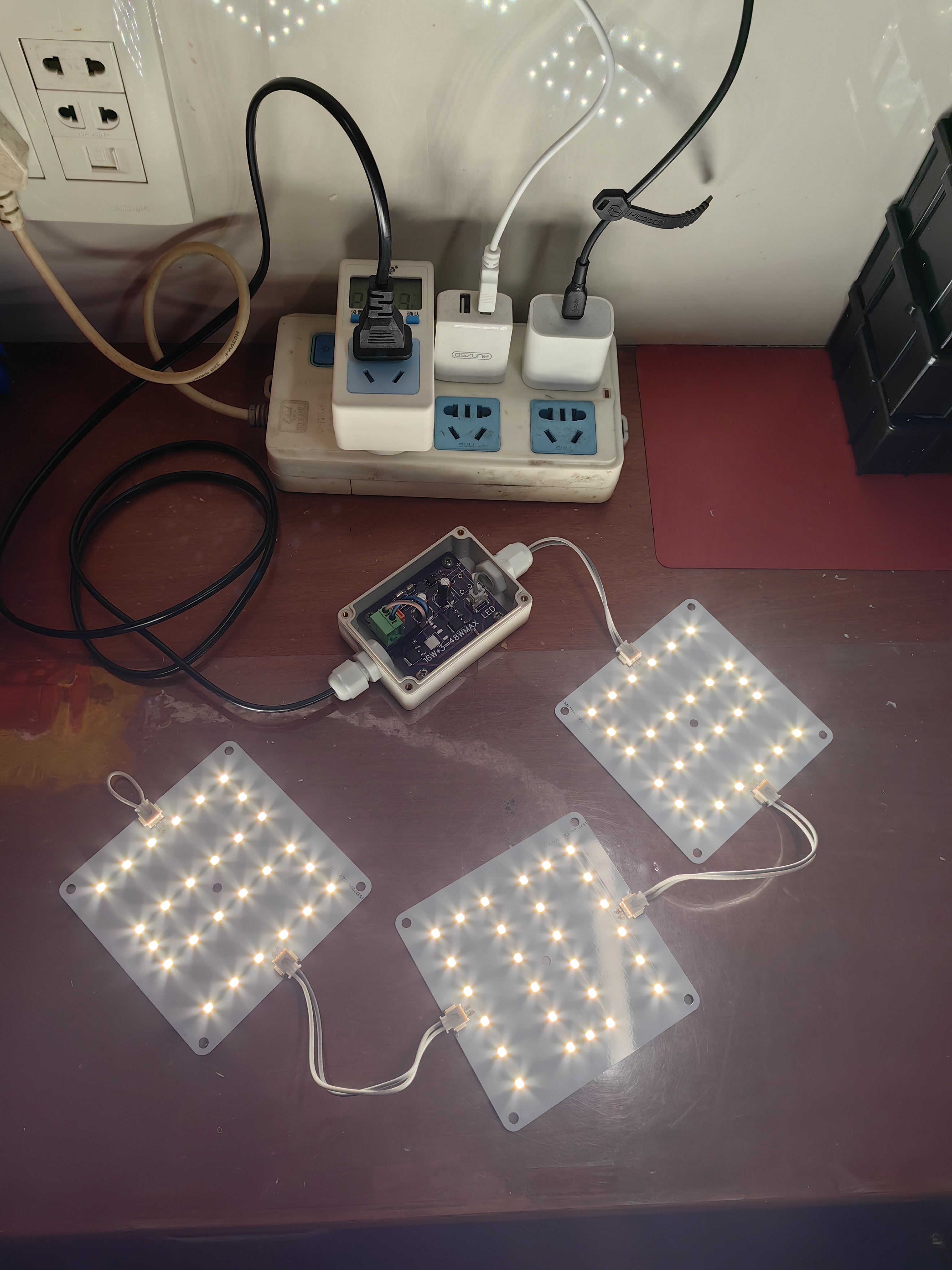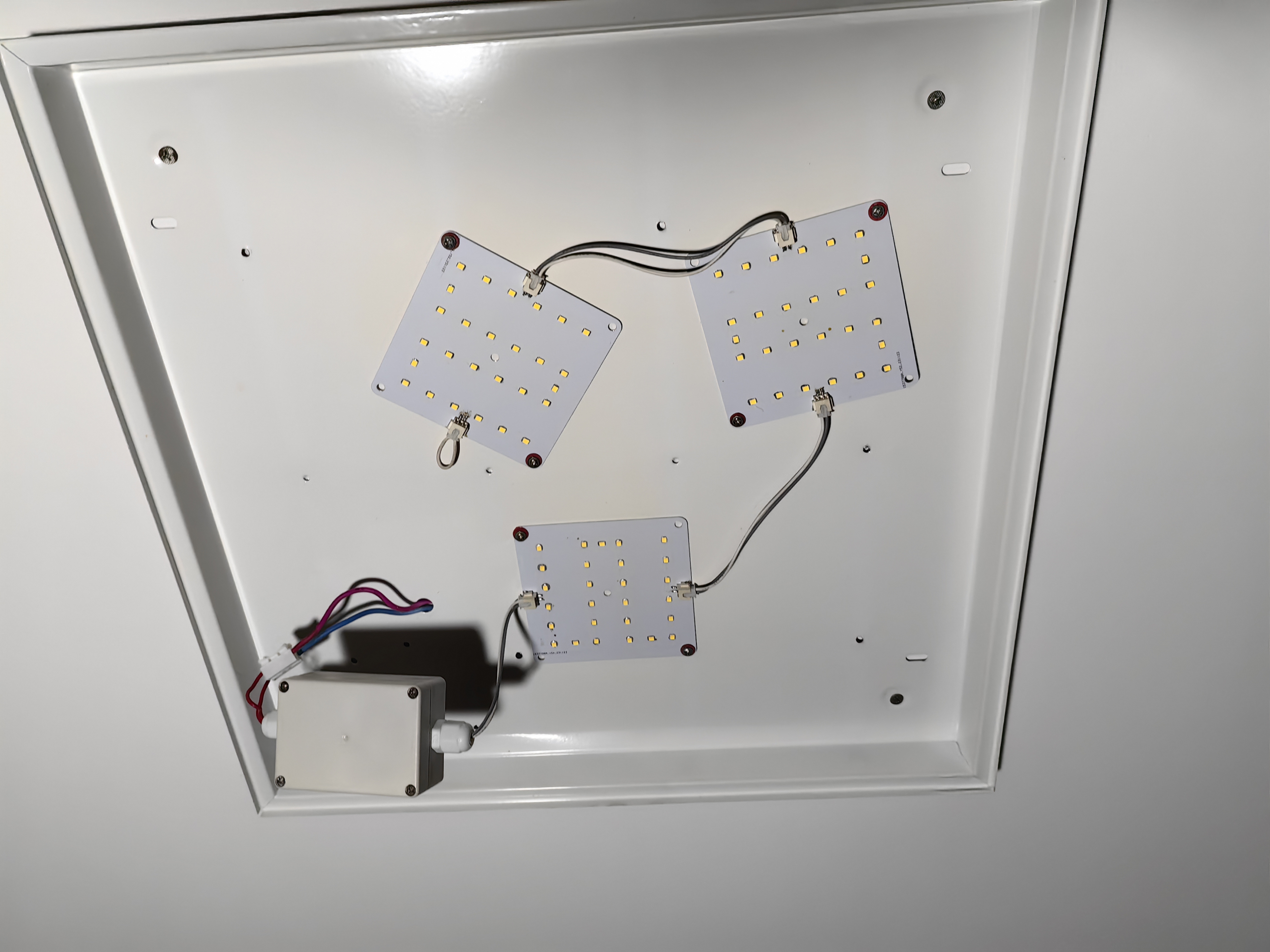 先上实拍图,可能是相机焦点问题,导致整体看上去不是很亮,但是实际我家里已经3个房间用上了我的自制LED灯板,实测效果20平方房间照明足以。