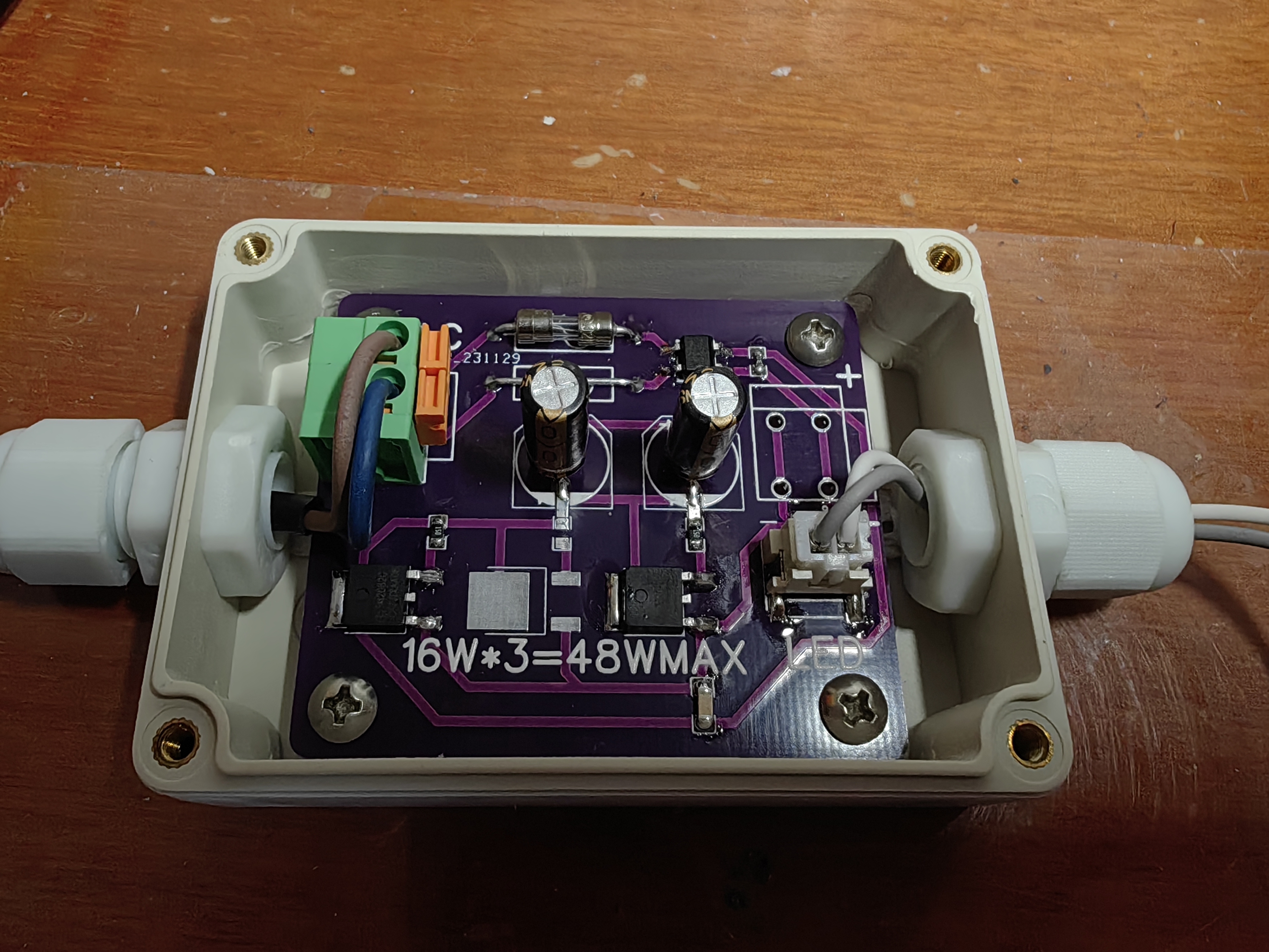 驱动器实物成品照片。可见我其中一个保险丝用了铁丝代替,驱动IC(SM2082G)也只焊了2个,一颗IC最大可支持60MA输出,可以根据自己的LED灯珠功率来设置焊接数量,接口可以根据需求焊接,图中的接口方案实际使用不是很好,感觉可以直接焊接到板子上就行,用接口的好处就是以后模块损坏了自己更换模块比较方便。