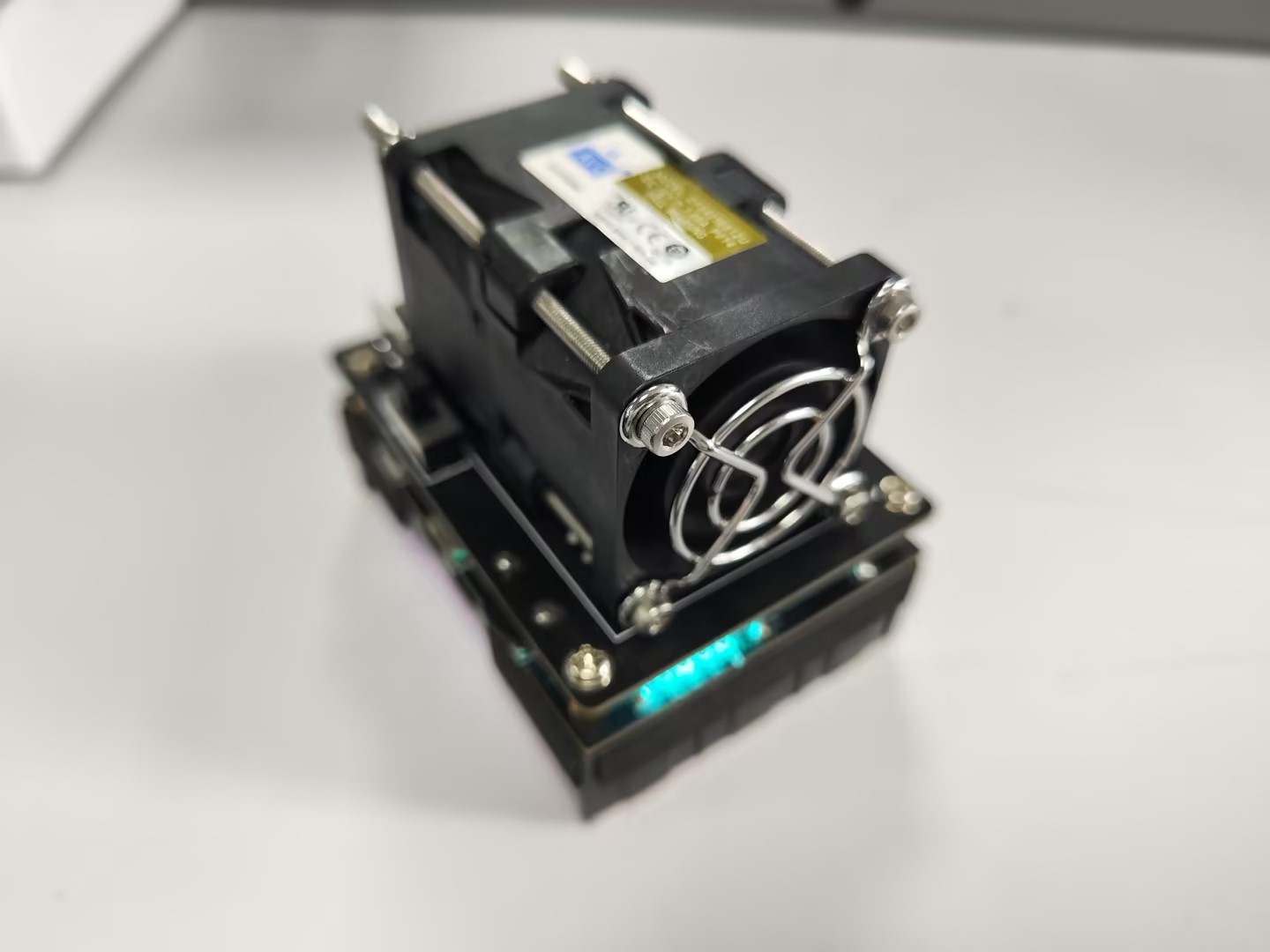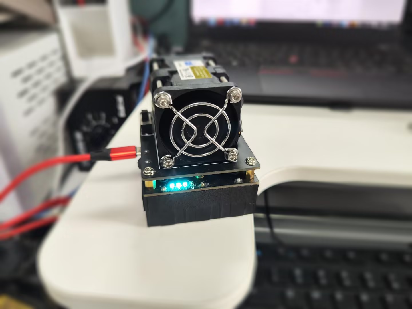 先展示一些成品图吧,一开始买的M3X70的长螺丝还没到,所以先用另一块空板子和边上的四个螺柱把风扇给强行固定住