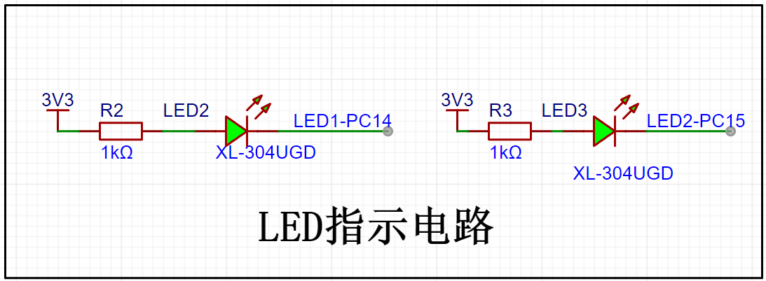 LED指示电路采用低电平驱动的方式,当单片机引脚输出为高电平时,LED灯熄灭。