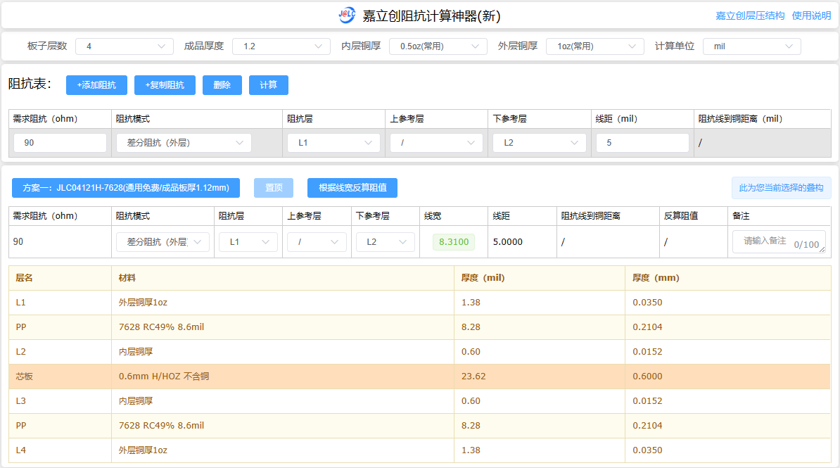使用嘉立创阻抗计算神器机械阻抗计算。