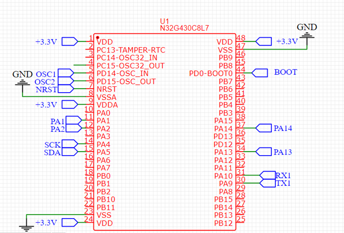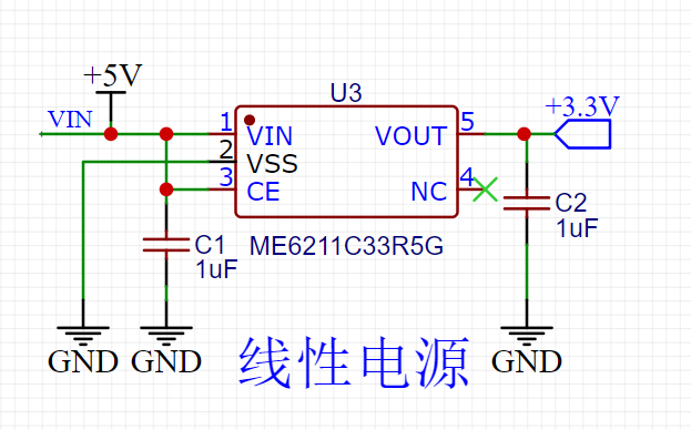 单片机的供电使用ME6211C33 LDO作为整个系统的电源。如果没有这款芯片也可以使用常见的RT9013-3.3作为电源芯片。
