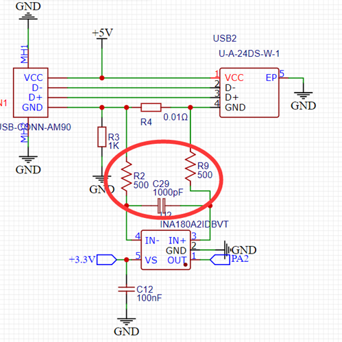 制作了一个简单的USB功耗测试仪,为了检测USB设备上的电流。通过使用TI的INA180A2电流感应放大器,对检流电阻上的电压进行放大,之后通过N32G430上的ADC对放大之后的电压进行采集,之后通过程序解算出通过检流电阻上的电流。