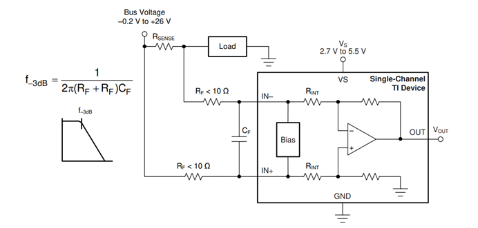 外部串联电阻的增加在测量中将产生额外的误差;因此,为了减少对精度的影响这些串联电阻器的值必须保持在10Ω以下。当在输入引脚之间施加差分电压时,输入引脚处将会产生偏置电流的失配。如果电路中添加了额外的外部串联滤波器电阻器,则偏置电流的失配导致滤波器电阻器两端的电压降失配。这种失配将产生差分误差电压,该电压将从分流电阻器两端产生的电压中减去。这个错误会导致设备输入引脚处的电压不同于分流电阻器两端产生的电压。如果没有额外的串联电阻,输入偏置电流的失配对器件操作的影响很小。这些外部滤波电阻器增加到测量中的误差量可以使用以下公式计算: