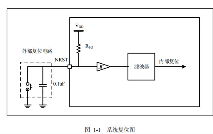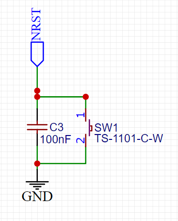 复位电路主要就是让单片机的复位引脚产生几个时钟周期的低电平即可,在这里并没有使用外部的上拉电阻,是为了确保可以被复位成功,主要原因是单片机的内部已经有一颗上拉电阻,如果外部再接一颗上拉电阻,就会导致等效的上拉电阻的阻值变小,那么根据一阶电路的零状态响应,NRST引脚上未必可以产生让单片机有效复位的低电平时间。但是有些经验丰富的工程师通过计算可以让单片机快速复位的同时也保证了复位功能。这就需要大家去深入地研究复位电路地更多信息了。