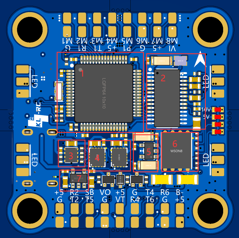 - 电调端子,丝印“GB5678RC”意为“GND,VBAT,M5,M6,M7,M8,RX5,CURR”,接线时注意线序