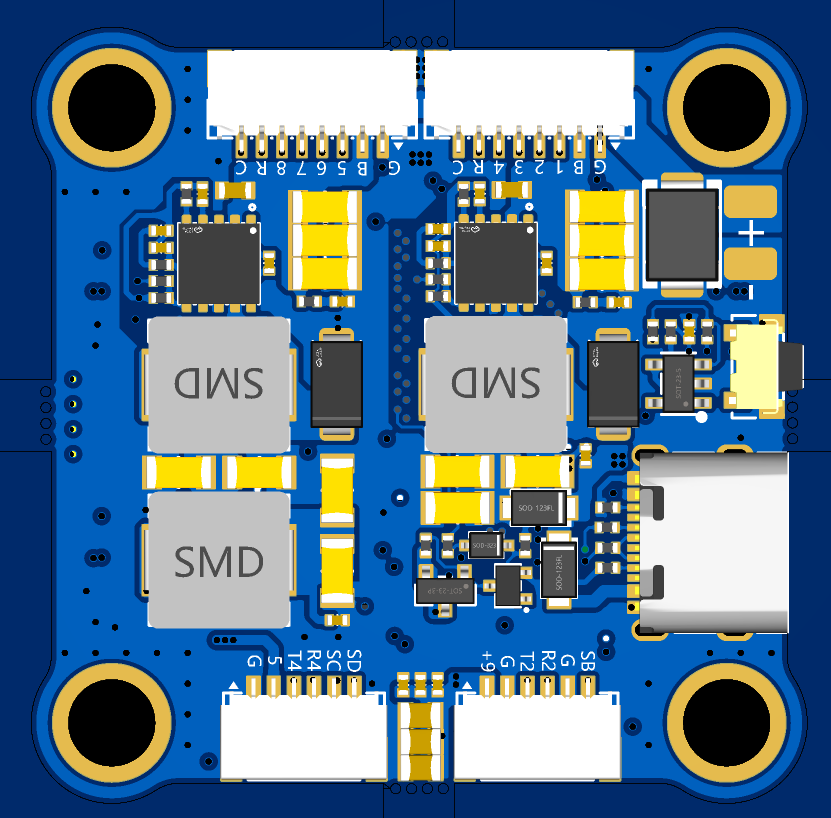 - 采用双IMU设计(双ICM42688P)实现稳定的飞行效果。让飞行更稳定,操控更加精确,无论竞速还是全速自由飞都能轻松驾驭。同时也支持替换为封装为LGA-14的陀螺仪。