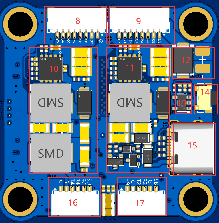 - 电调端子,丝印“GB1234RC”意为“GND,VBAT,M5,M6,M7,M8,RX5,CURR”,接线时注意线序