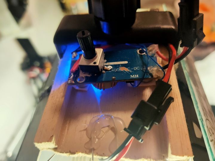 降压模块自带的电位器不用拆,在背面并联焊了一个10K 的单圈电位器,RV09。先把RV09 拧到最大阻值,再用模块自带的电位器把电压跳到9.5~9.6V 左右,相当于设置了电压上限。开关是从降压芯片的EN 引脚飞了一根线,连到一个自锁小按钮。