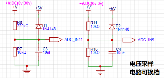 - 电路保护:使用钳位二极管1N4148保护ADC引脚。
