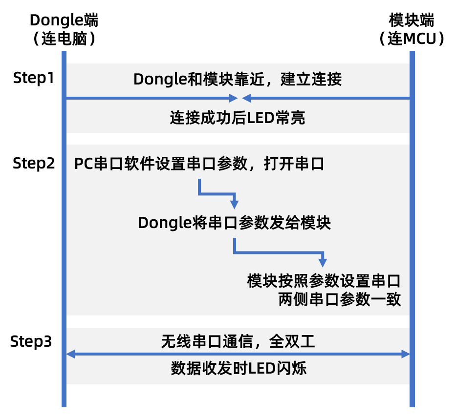 Dongle和模块之间如何建立连接?Dongle和模块支持“一碰连”。Dongle和模块互相靠近时,彼此接收到的无线信号都会增强。当信号强度超过设定阈值,Dongle和模块就会自动连接,所以只需在Dongle和模块上电后,彼此靠近一下就能连上。第一次配对后信息保存,下次上电自动重连,掉电后上电自动重连。模块上有一个红色LED灯,连接成功后LED常亮,通信时LED闪烁。