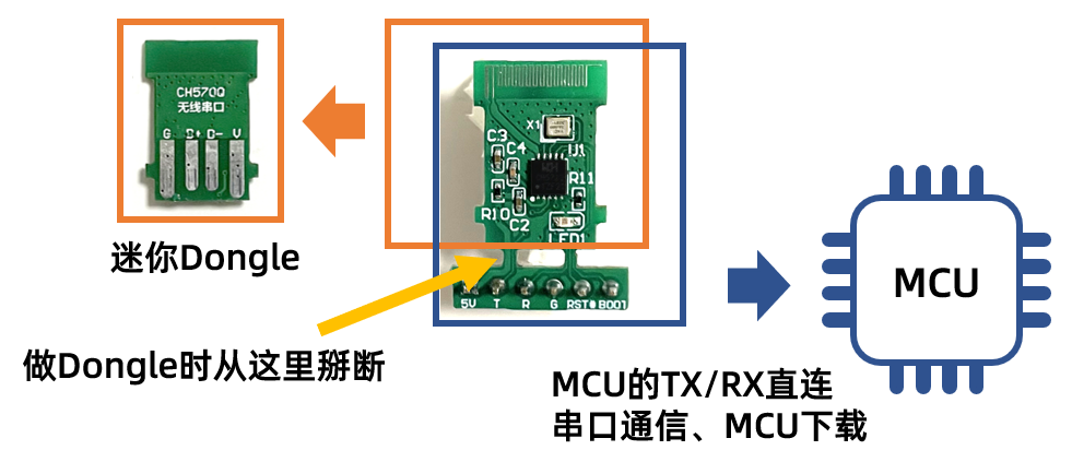 模块端做无线2.4G和有线串口的双向透传:CH570接收Dongle端发来的串口参数,根据参数配置自身串口,将收到的数据用串口发给MCU,同时将MCU发来的数据用2.4G传给Dongle。