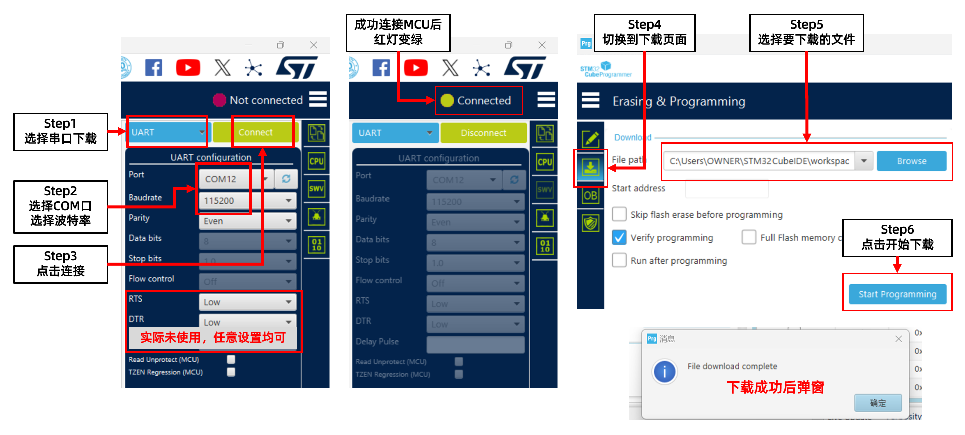 使用本工具给STM32F103下载程序的流程与使用常规串口下载工具无异。基本步骤如下图: