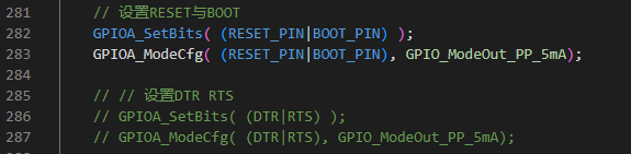 如果需要RTS、DTR功能,到APP目录下,将uart.c、uart.h、rf_uart_tx.c中与RTS、DTR相关的代码激活,并注释掉RESET_PIN、BOOT_PIN部分即可。下图展示其中一处: