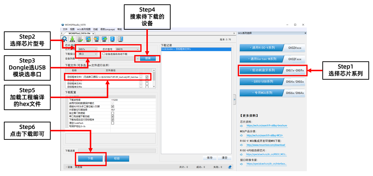 将模块与USB串口模块连接,在WCH ISP Studio中设置下载接口为“串口”,下载模块程序。