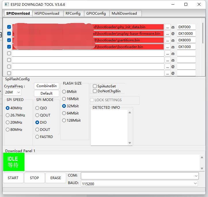 先点击右侧的三个小点选择需要写入的文件,总共四个文件,然后填写每个文件对应的地址(不要填错),其他配置按照图中设置; - 右下角COM位置选择当前识别的COM口,可以到设备管理器中查看,如果无法识别COM口,需要重新检查电路焊接,重点CH340电路以及电脑驱动是否正确安装;