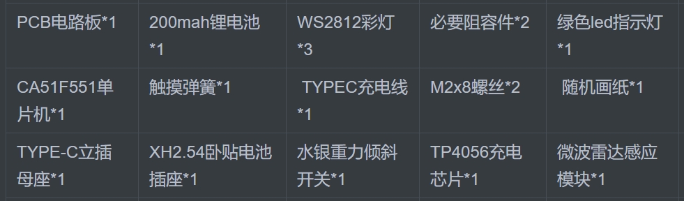 硬件: TP4056充电芯片、LED翠绿指示灯、WS2812彩灯、常用阻容件、TYPE-C立插母座、XH2.54卧贴电池插座、水银重力倾斜开关