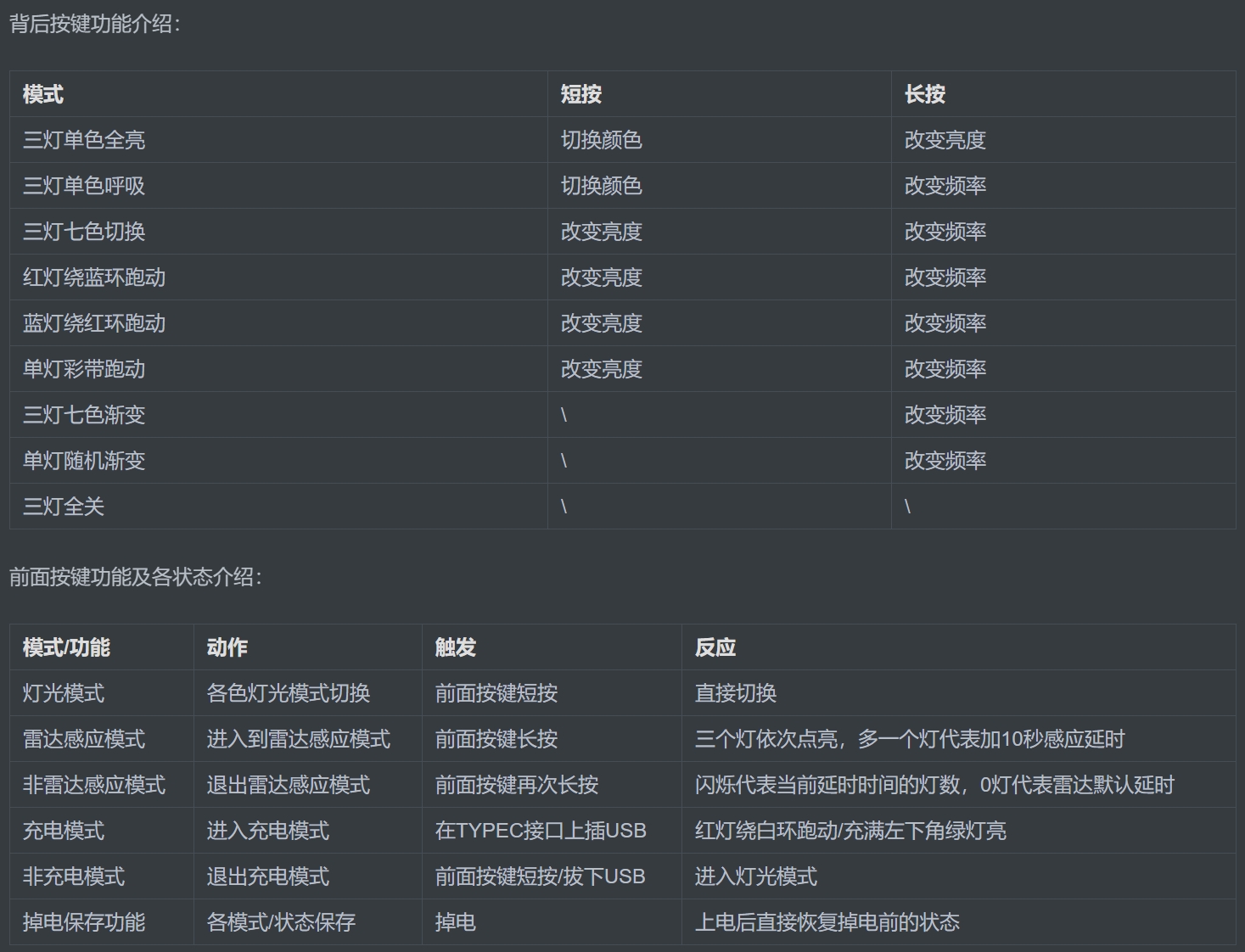 - - 通过两个按键的短按长按组合可以任意切换颜色、亮度、闪烁频率、切换雷达感应模式、配置雷达感应死区时间等参数