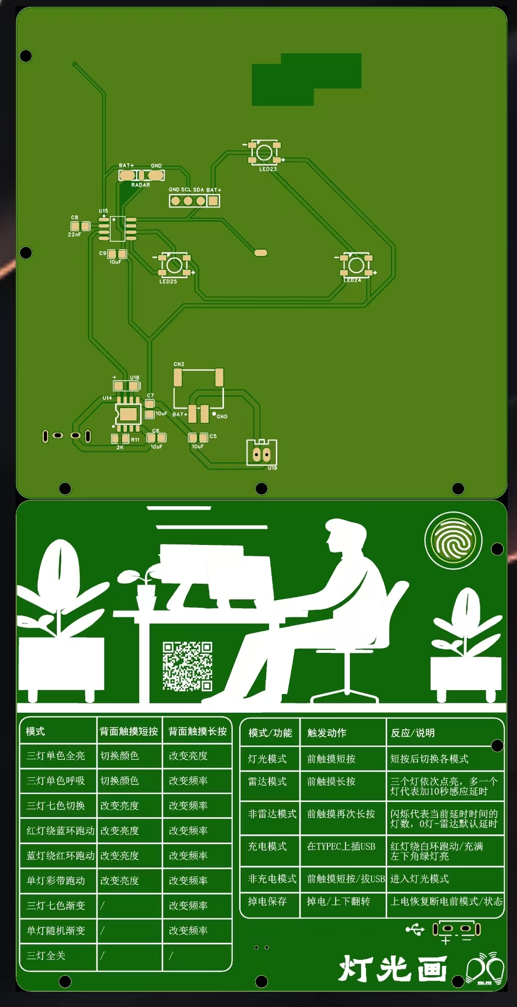 简介:可以充电的彩色灯光画,有两个触摸按键,用的触摸弹簧,可以巧妙的更换画纸;通过按键长短按组合可以配置各种模式及对应的参数,有雷达感应模式,可对数据进行掉电保存,翻转上下电,可做桌面摆件/氛围灯开源协议
