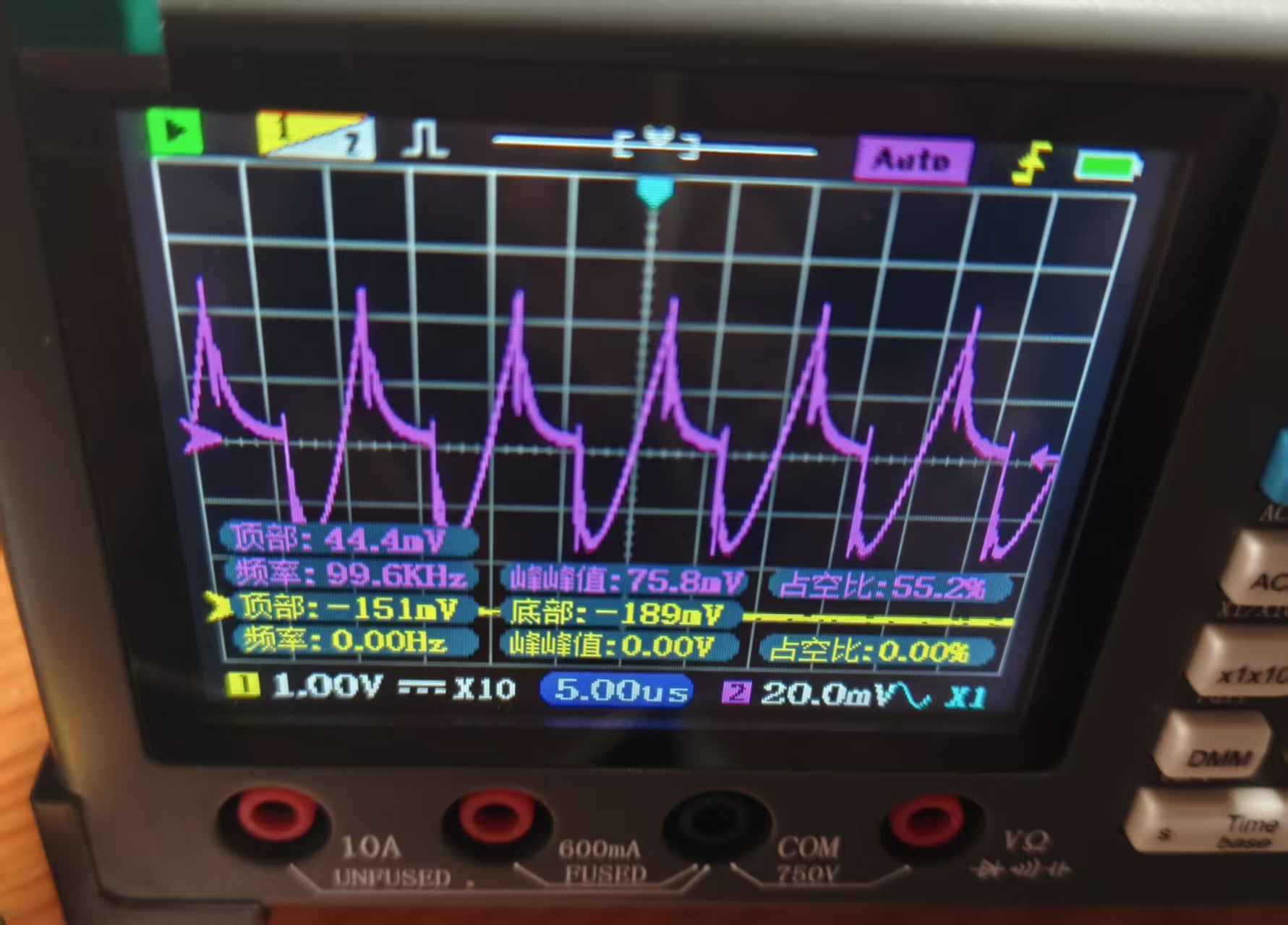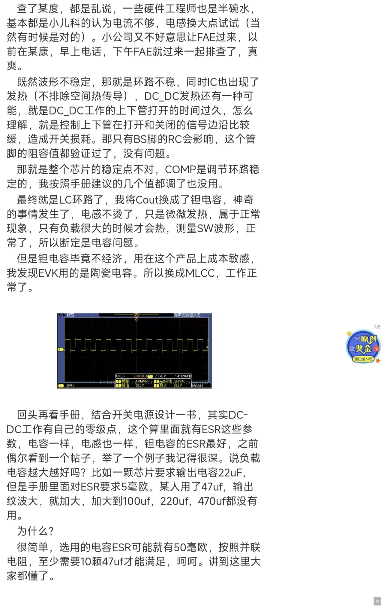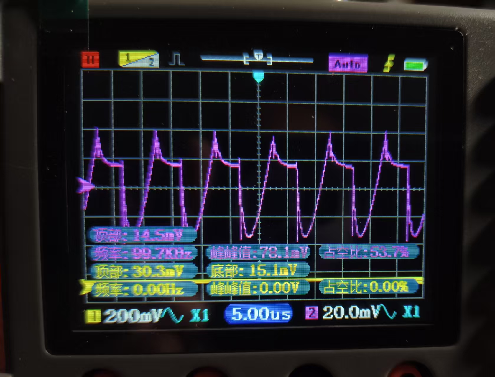 1.我们的开关频率只有100kHz,但示波器上的震荡在两百多k,应该是板子功率布局不合理,导致寄生参数引发震荡,而铁硅铝的分布式气隙对高频,小幅度振荡的阻尼效果极强,导致铁硅铝将振铃能量转化为了热能(以后不能无脑铁硅铝大磁环了,虽然饱和电流很诱人);