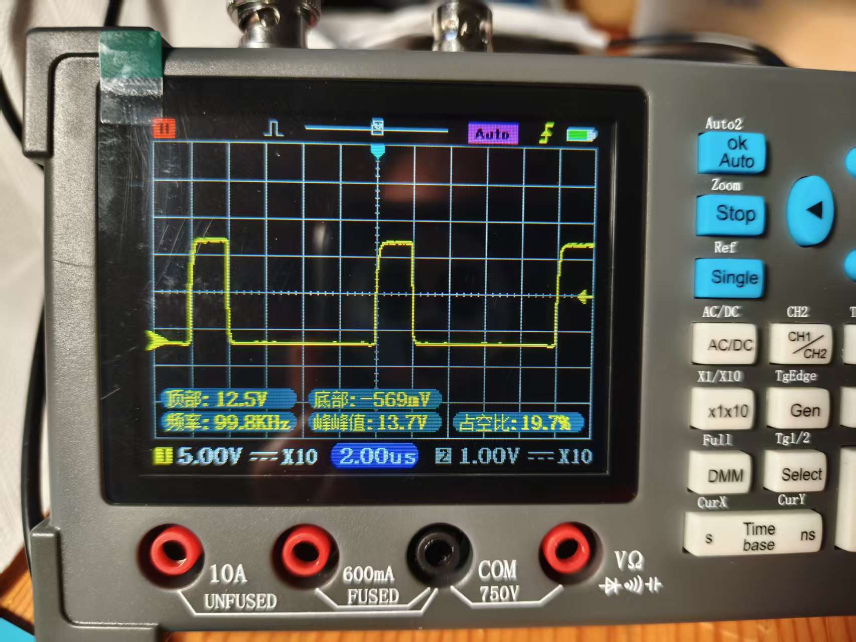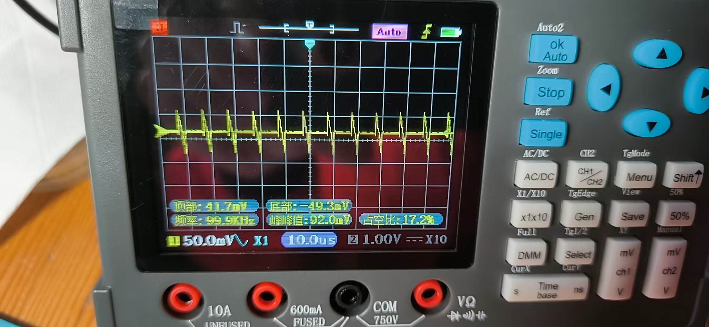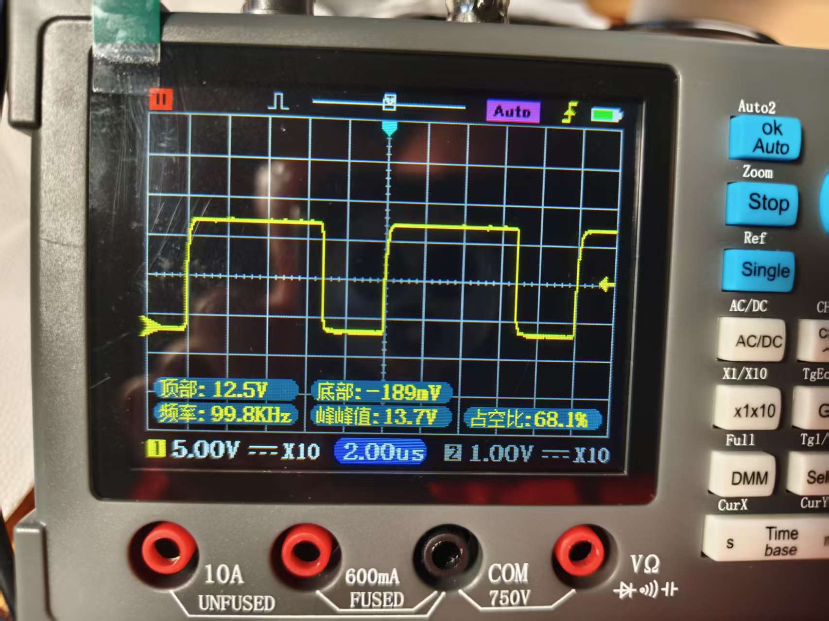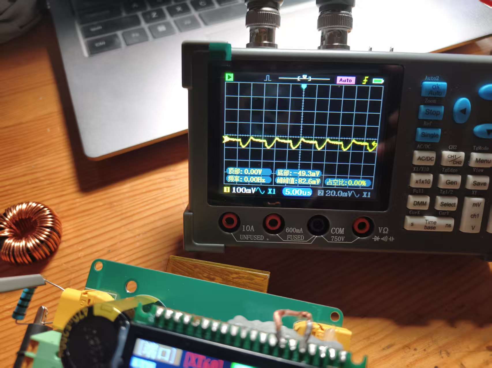 感觉是电容位置的问题,于是又在输出的接头上各并联一个100V-10uf的固态电容,纹波来到了80mV左右,感觉继续加下去也不会有太大改善了,应该换其他容值的,但是手头上没有。