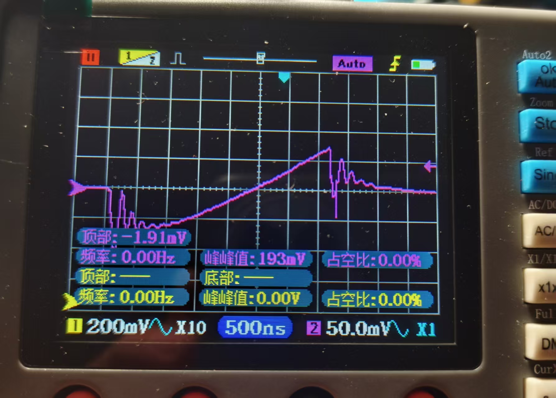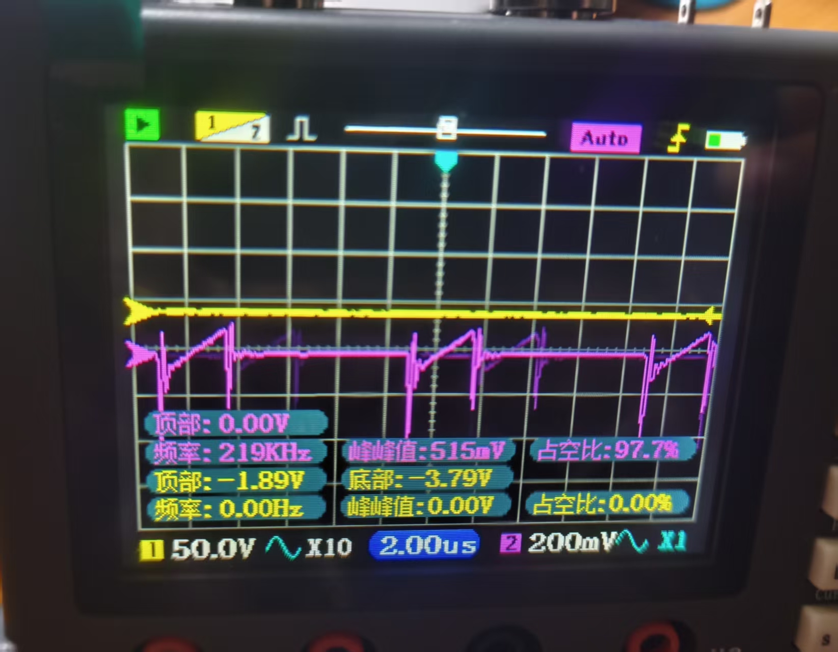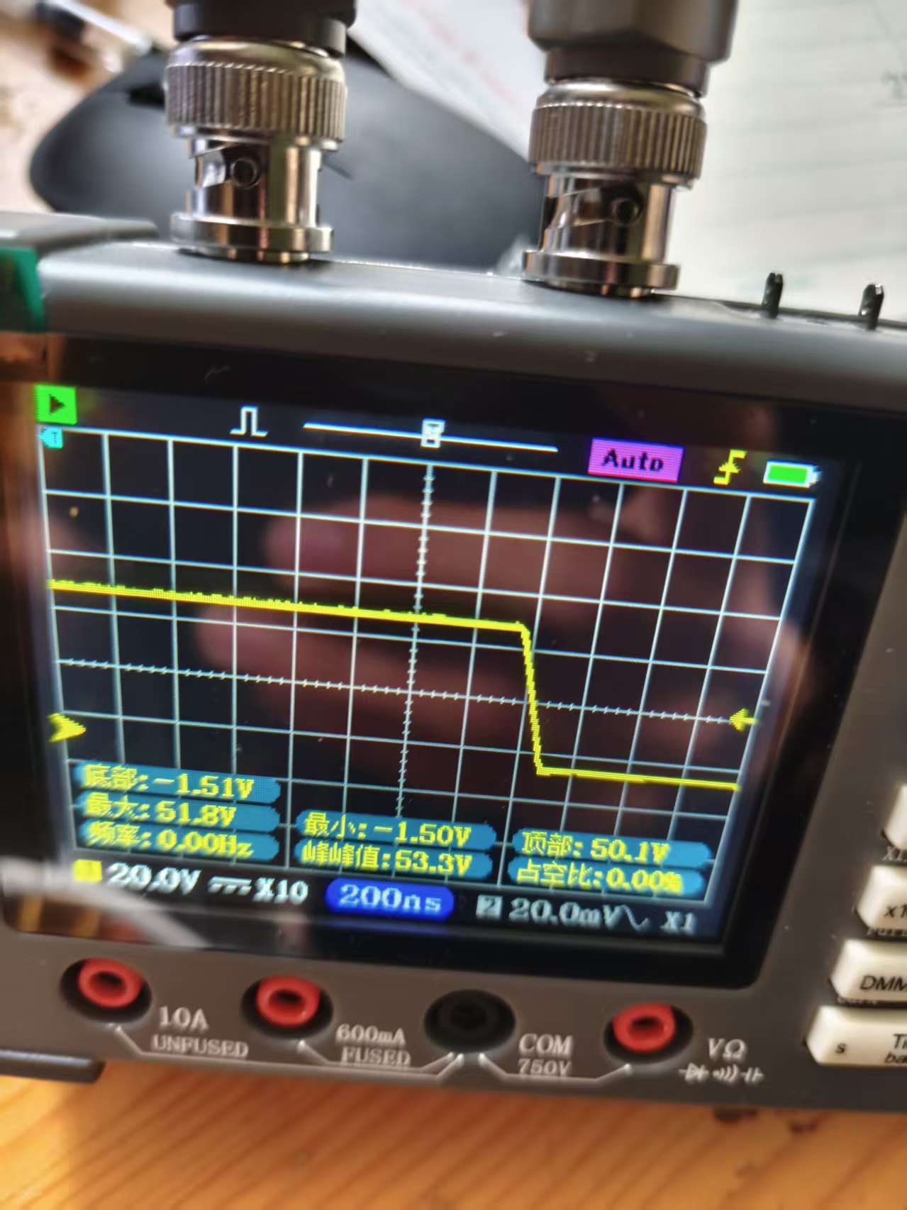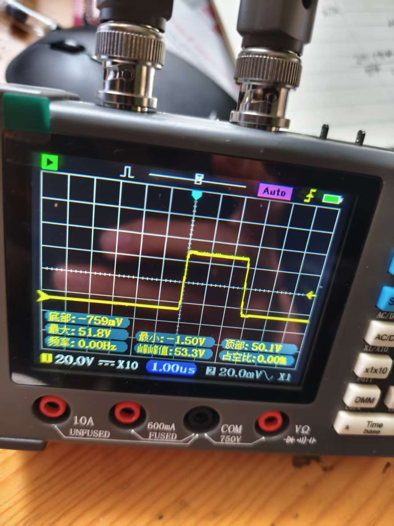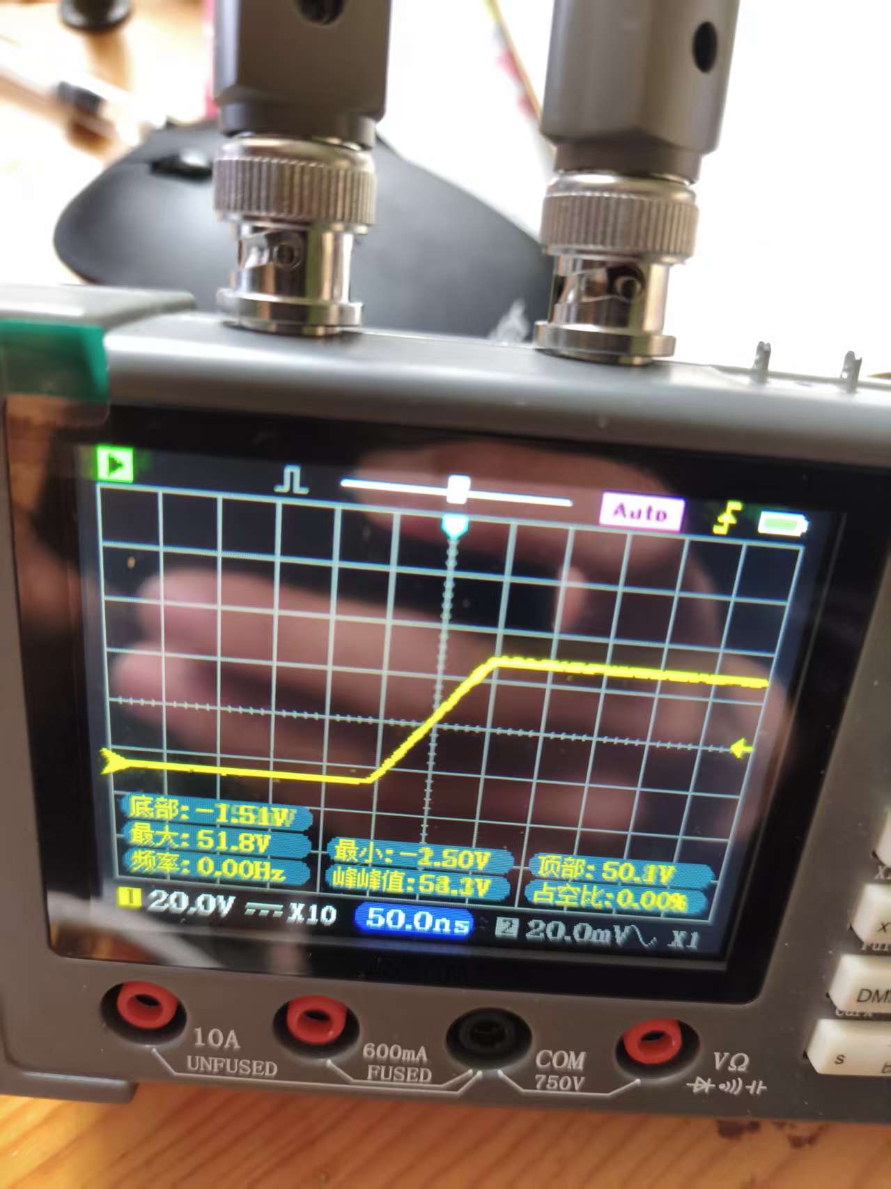 2026.1.24 突然想到个问题,既然用铁硅铝测出来波形有震荡,铁硅铝将高频震荡阻尼了,但是高频震荡可以轻松通过铁氧体啊,实质上高频震荡并没有消失,那岂不是全加在mos上了,于是我又是1kΩ负载,20V输入,53V输出的条件下去测量后级mos的漏极相对于地的电压波形(就是输出端和电感以及地相连的那个mos),很奇怪,几乎看不到电压尖峰(之后也测了每个mos的d相对于地的电压波形,也看不到震荡,也可能是震荡频率太高,示波器显示不了)