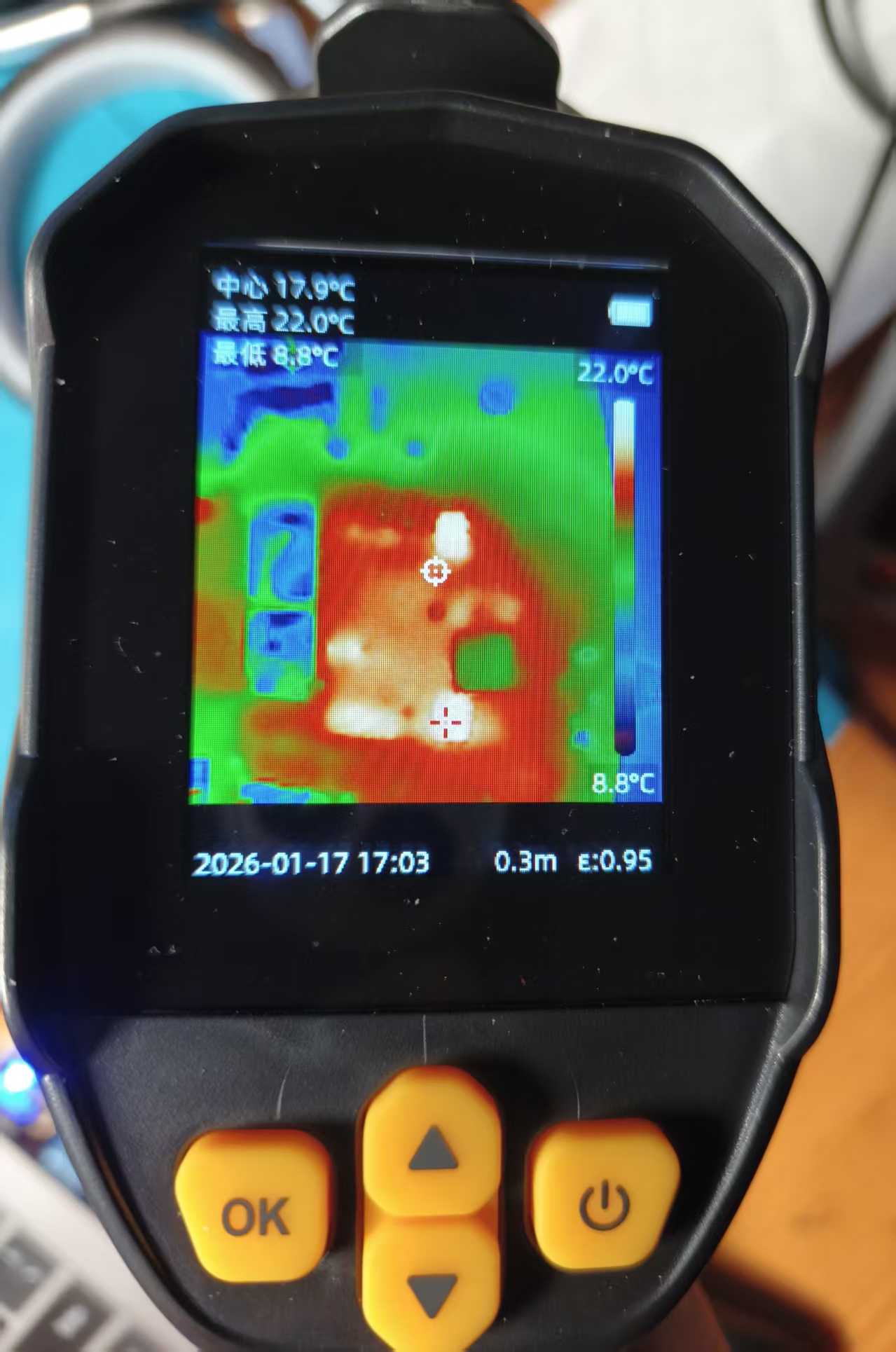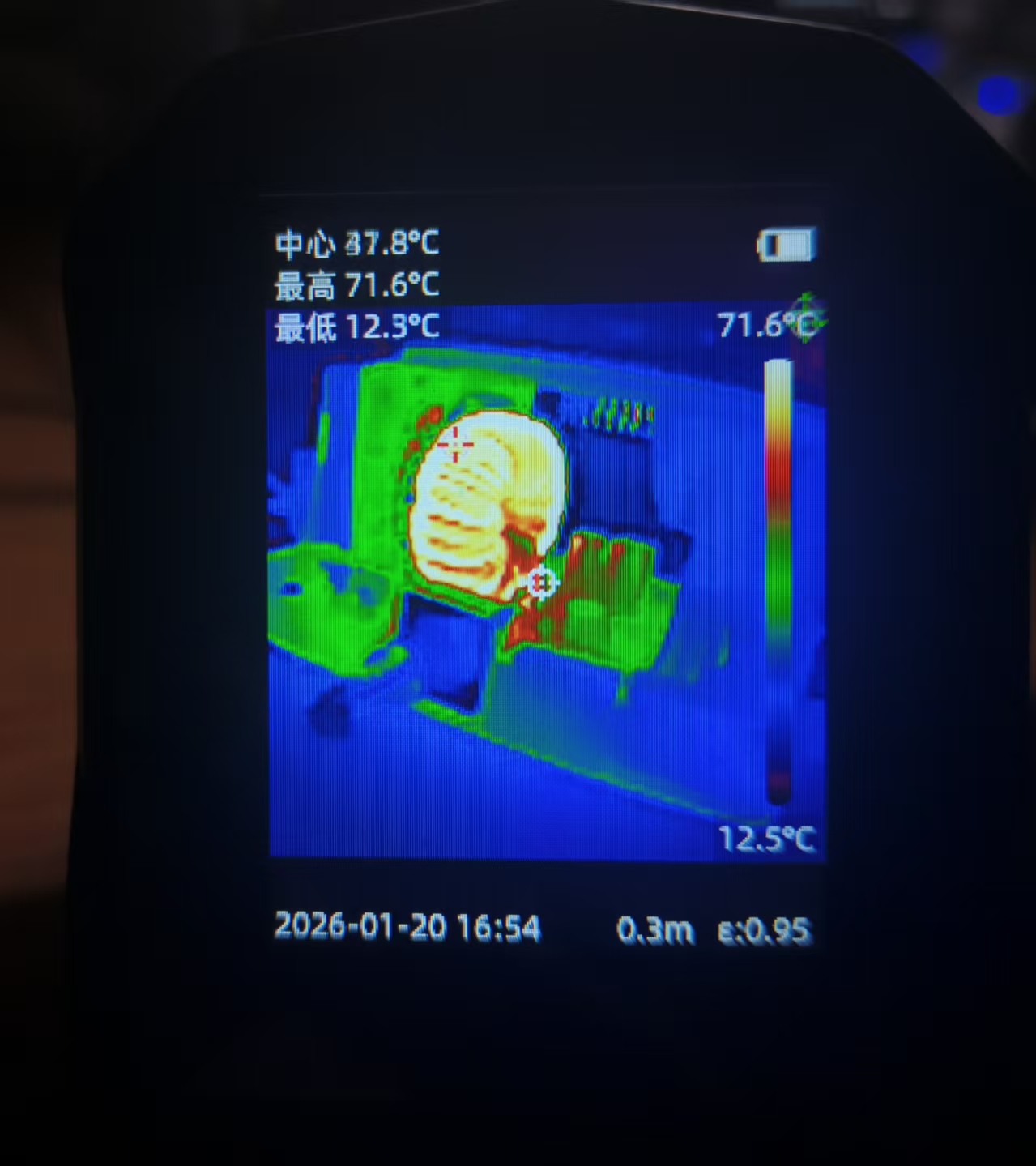 这种铁氧体磁芯的比热容应该挺大的,焊接后晾了十几分钟还是热乎的,但是等不及了,就直接开测了,还是熟悉的配方,时间是开机10分钟,可以看到,比铁硅铝改善太多了。