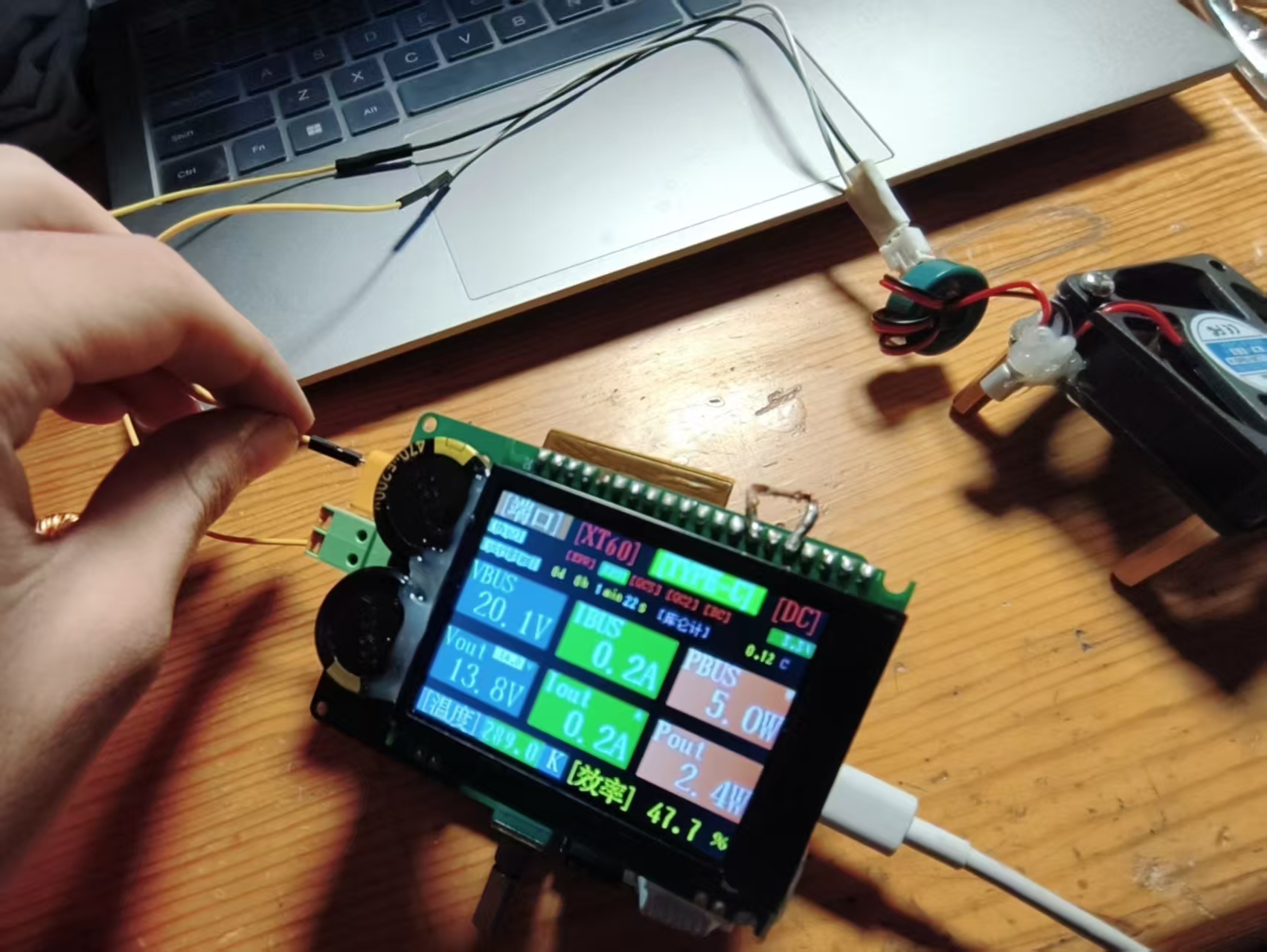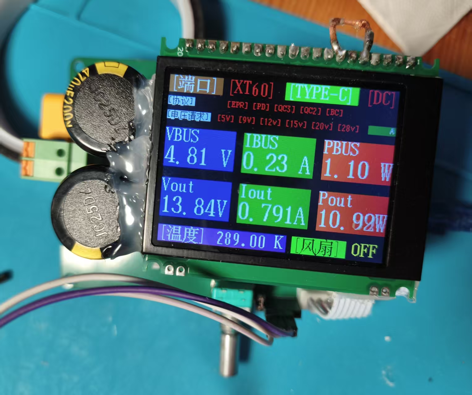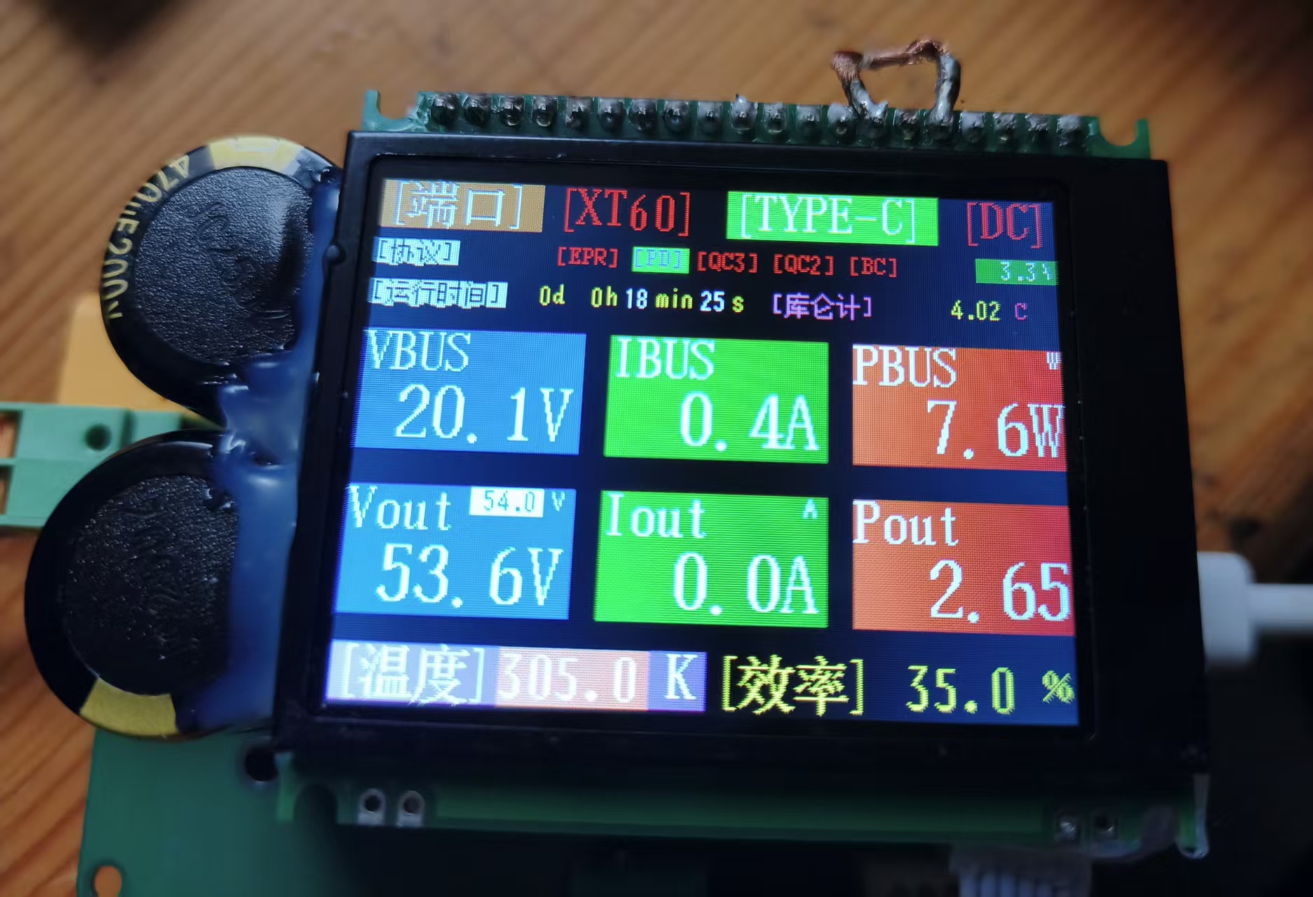 这里电压都是比较精确的(相对于我的万用表,从小数点第二位出现偏差,差值在0.04左右浮动),这个电流ina226肯定是比较精准的,就是这个霍尔电流传感器在电流非常小的情况下(我这里是20A量程的)误差比较大(后来发现是计算公式0.066敲成了0.0066,翻了十倍),直接给我干个能量不守恒了,这点我再想想怎么搞个软件滤波,温度这里懒得给℃取模了,就直接用开尔文当单位了,现在还只能用EC11调电压,之后再把交互调一下