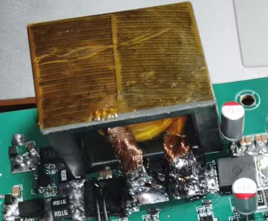 2.由于1的问题,我决定先用DC口供电(DC电源适配器用的鸡哥19V==6.32A的电脑充电器),再用示波器查看CH442E和CH224Q的工作情况,结果插上电后,TX4220的1号引脚,也就是开关输出脚,迸发出火星后喷发浓烟,当场烧毁