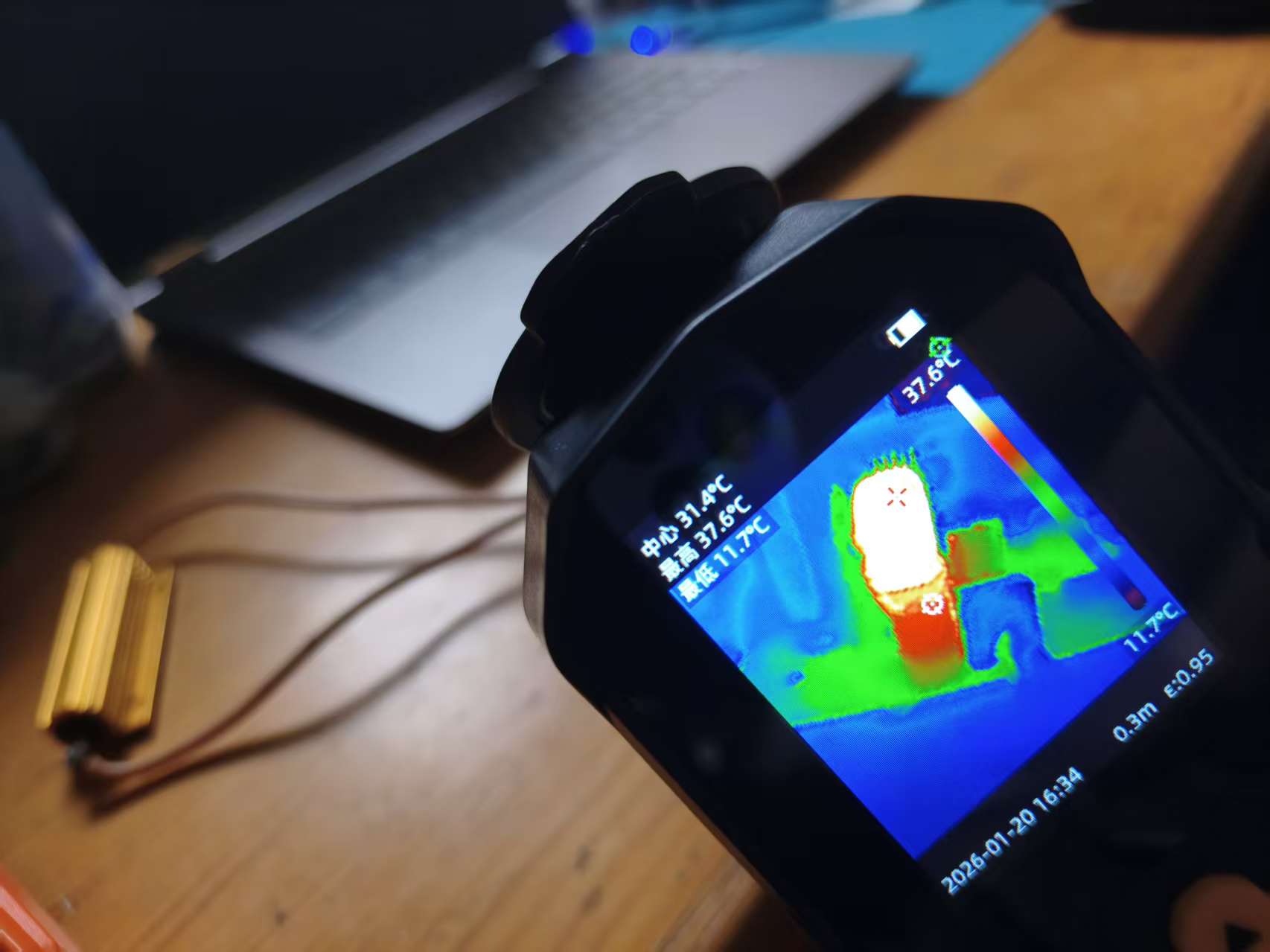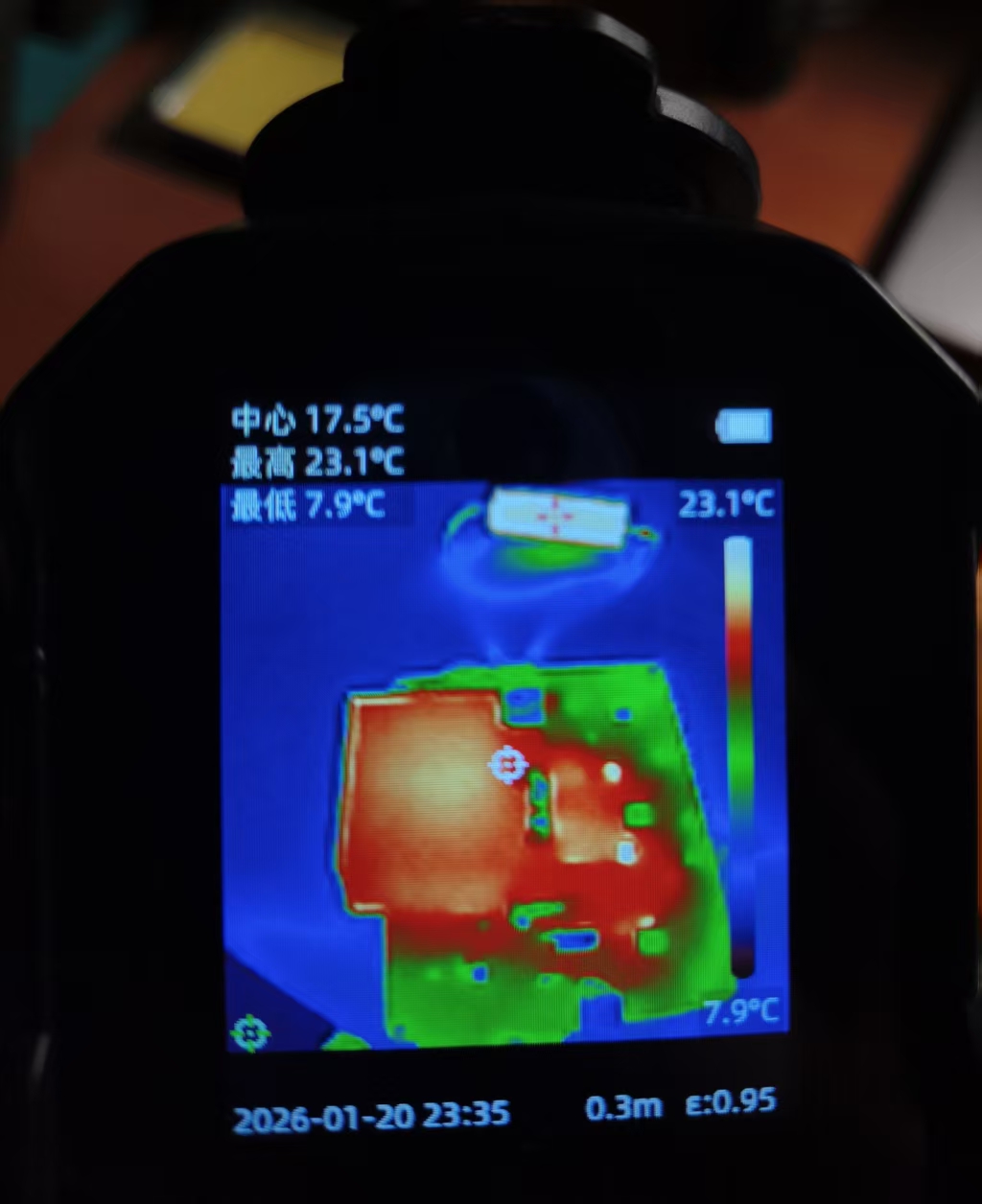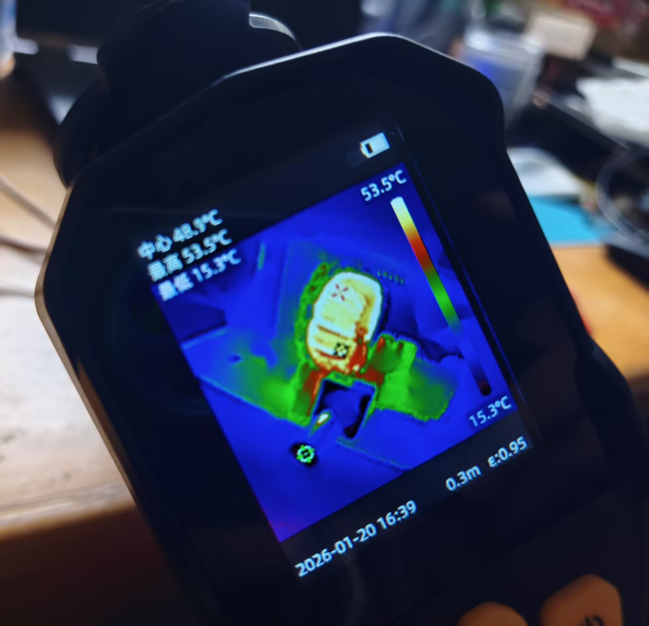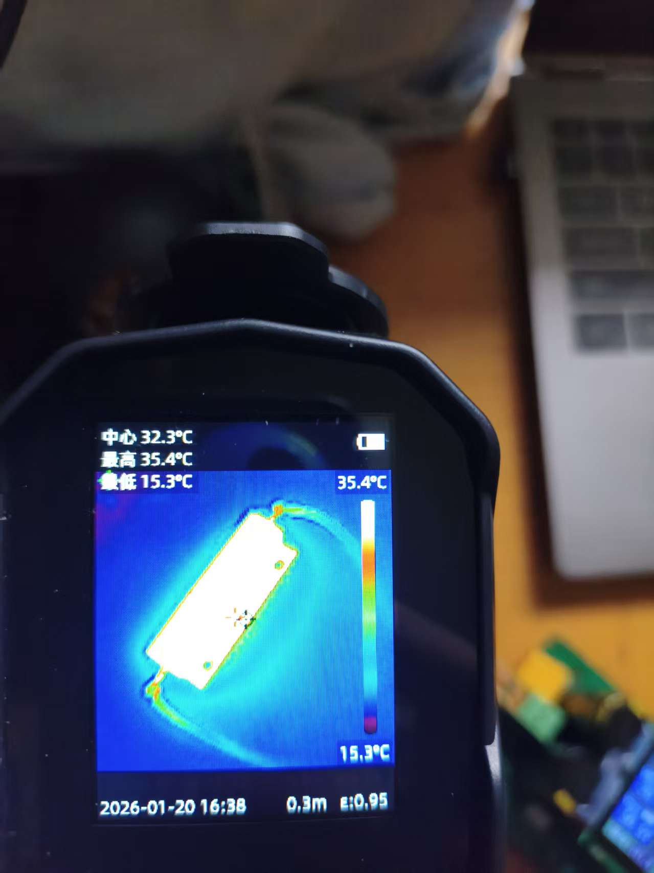 测试条件:环境温度10℃,20V输入,升压到53.6V(从3.3V开始,逐渐上升),观察温度变化,为什么只升到53V呢,往下看就知道了。