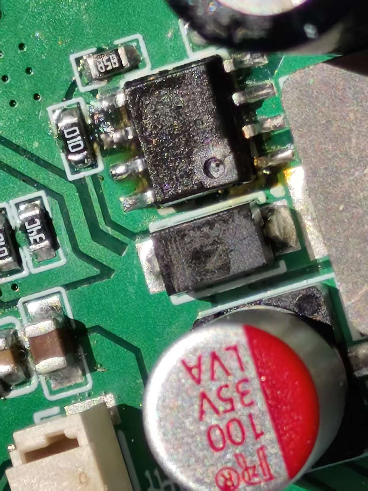 经过一个多小时的排查与检修,最终发现只有两颗电容失效短路,就是给输入降到3.3V的降压芯片的输入电容,应该是风扇启动浪涌电流太大导致的,最终只有电容受伤的世界达成了。