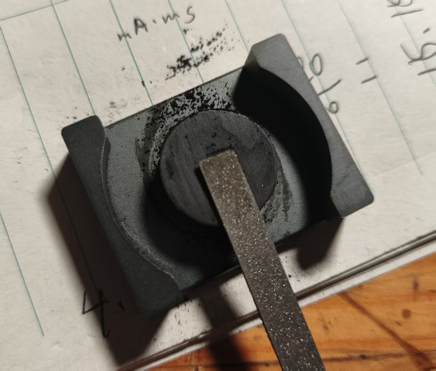 大概是磨了这么多,感量降到了21.6uH,已经足够了,磨太多增加损耗