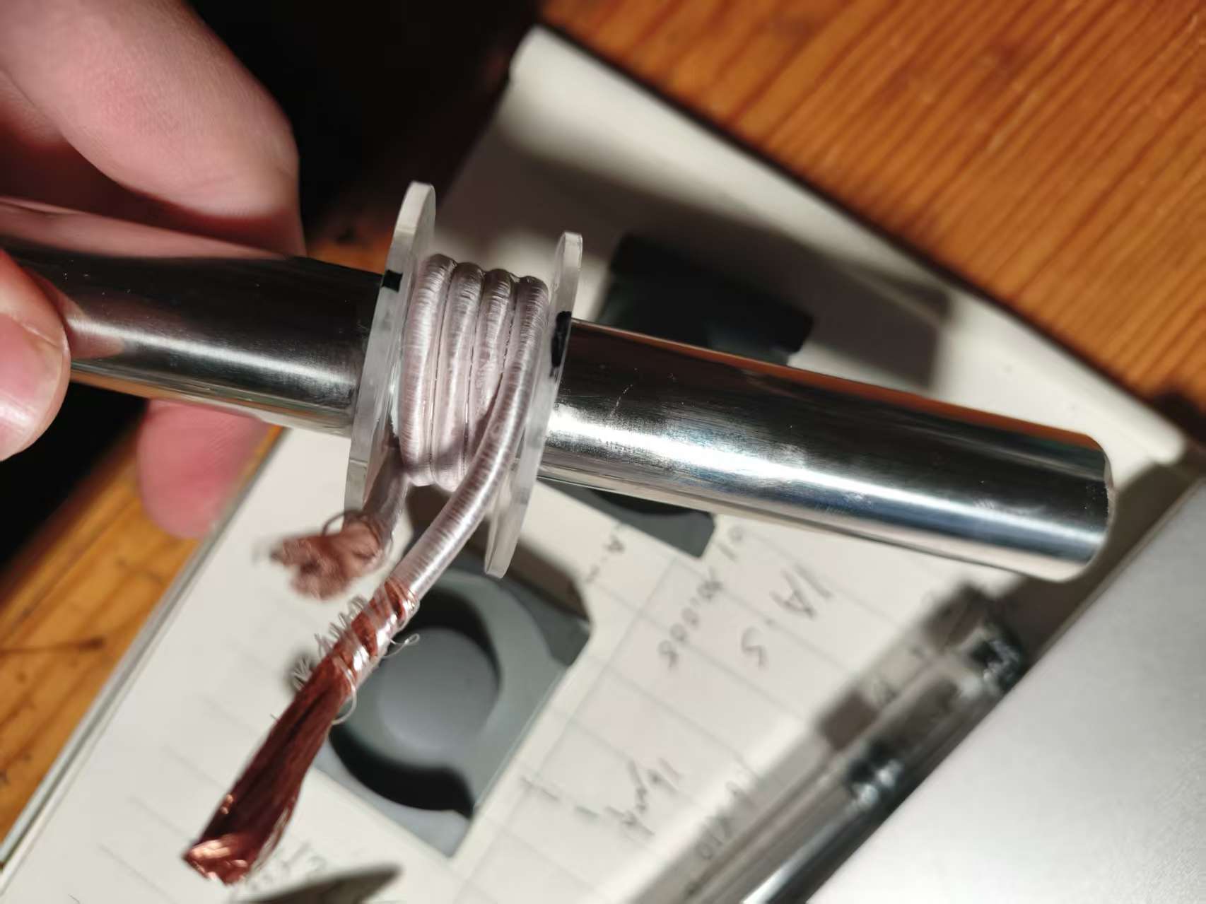 接下来更换为铁氧体电感,对高频振铃几乎透明,所以应该不会怎么发热,因为网上扁平线电感22uh的饱和电流只有10A,我们目的是至少20A,而且现买的话快递比较费时间,所以我就用手上剩余的EQ4020 PC95的磁芯自己绕了一个,用的0.1*600的利兹线,四匝刚好绕满一层。
