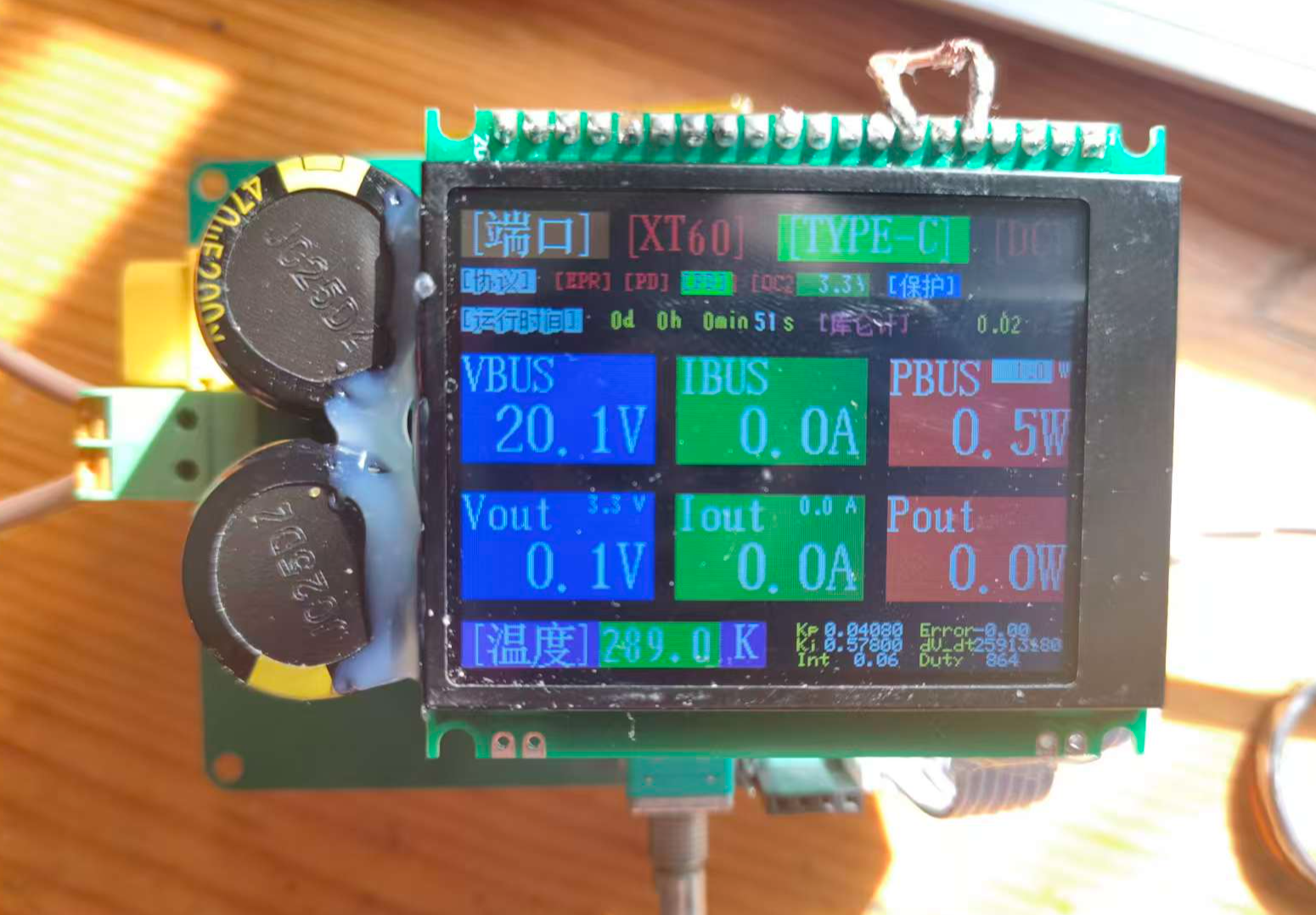 2026.1.22 重新调整PI参数,删除了效率显示(霍尔电流传感器结果跳变太严重了,但是我只会平均值滤波,先存5个数据,然后排序,剔除最大值和最小值后取平均值,然而并无卵用,不仅降低了反应速度,跳变问题依然存在,然后你能看到输出功率大于输入功率的情况,直接能量不守恒了,所以也放弃了这个算法,同时删除了效率显示,换成了PI控制的显示,最后录了个视频放到b站了,代码在附件里,选择24Mhz下载就行,如果能看看代码,给点高级建议就更好不过了)