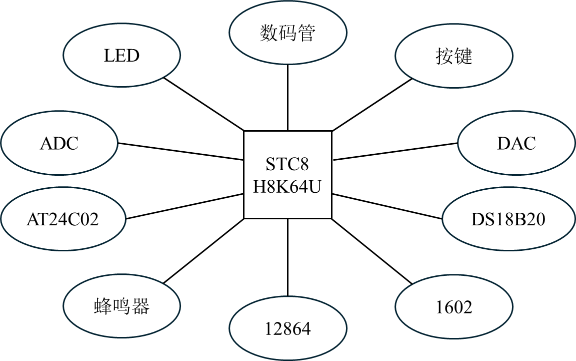 作为一块学习板,其功能如下图所示,包含了51单片机入门的必备模块