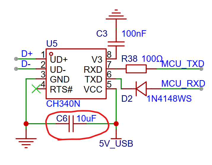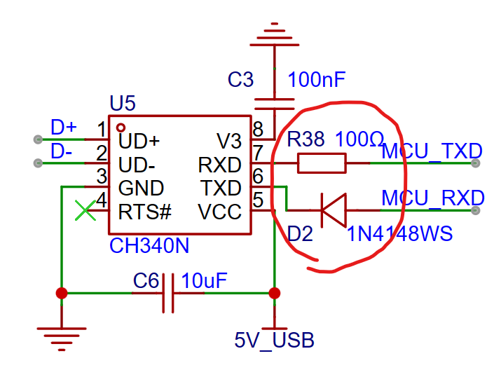 2. CH340的RXD和TXD对应MCU的TXD和RXD。同时,为了保证STC芯片冷启动,需要在CH340的RXD引脚上串联一个小电阻,在TXD引脚上串联一个二极管,否则CH340将会向芯片供电,并使VCC带电,实测若无电阻和二极管时VCC约为3V(供电电源为5V)