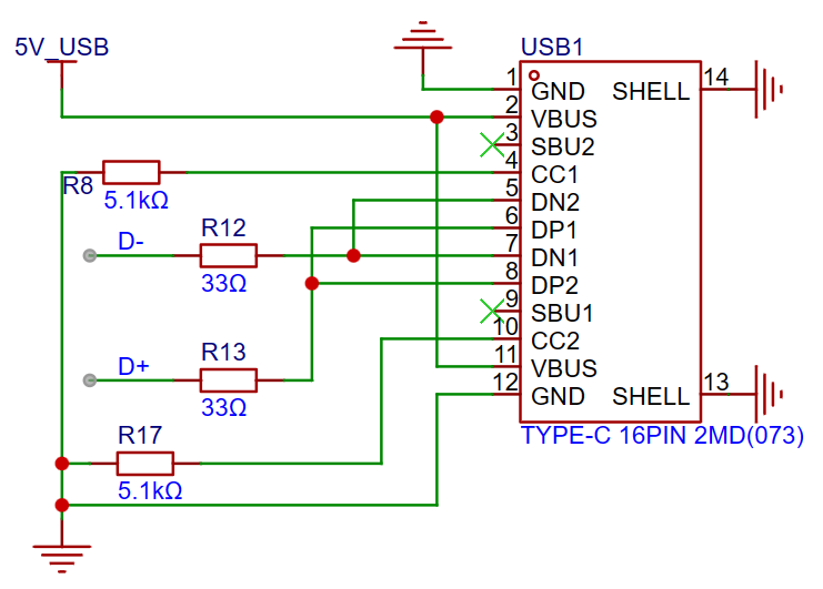 技术群的大佬们普遍认为这种低速电路中CC和DP、DN上的电阻是无关紧要的,而在高速电路中应当加入。但是曾经看过b站某up说过:“Type-C的CC不接电阻还能用,那是Type-C对你的恩惠。”这说明还是得按着官方文档来的,要不然可能出错。
