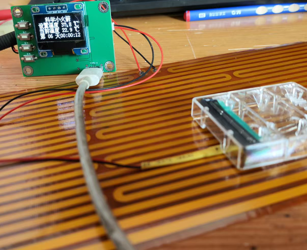 由下至上放置顺序:泡沫箱底板,一层卫生纸,电热膜,一层卫生纸,不漏水的水袋,透明胶固定传感器探头在水袋上,放置鸡蛋(其他蛋也可以),盖一层卫生纸,泡沫箱顶盖,泡沫箱顶盖应开小孔透气。