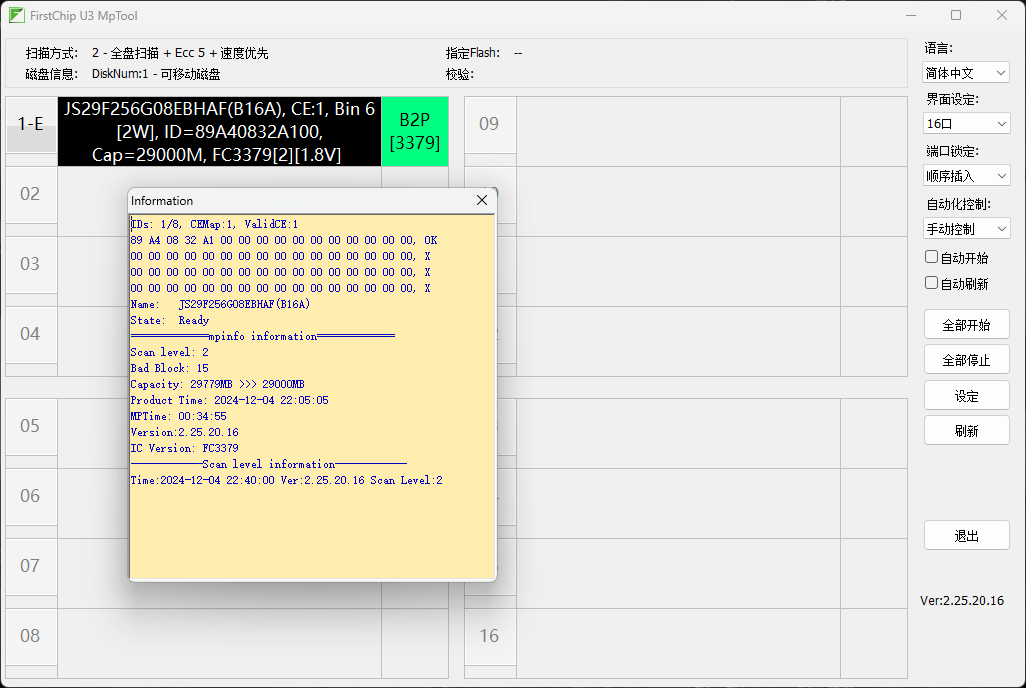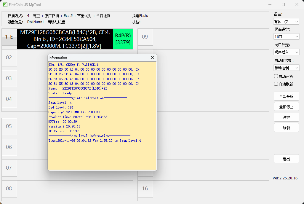 可以看到4个CE都正常识别。但是直接开有BUG,跑圈校验失败,换PSLC开正常,跑圈也OK。这个并不是颗粒太烂的原因,而是3379对这种老MLC支持很差,固件不完善。因为这个颗粒我在2246EN上测过的,体制很好。