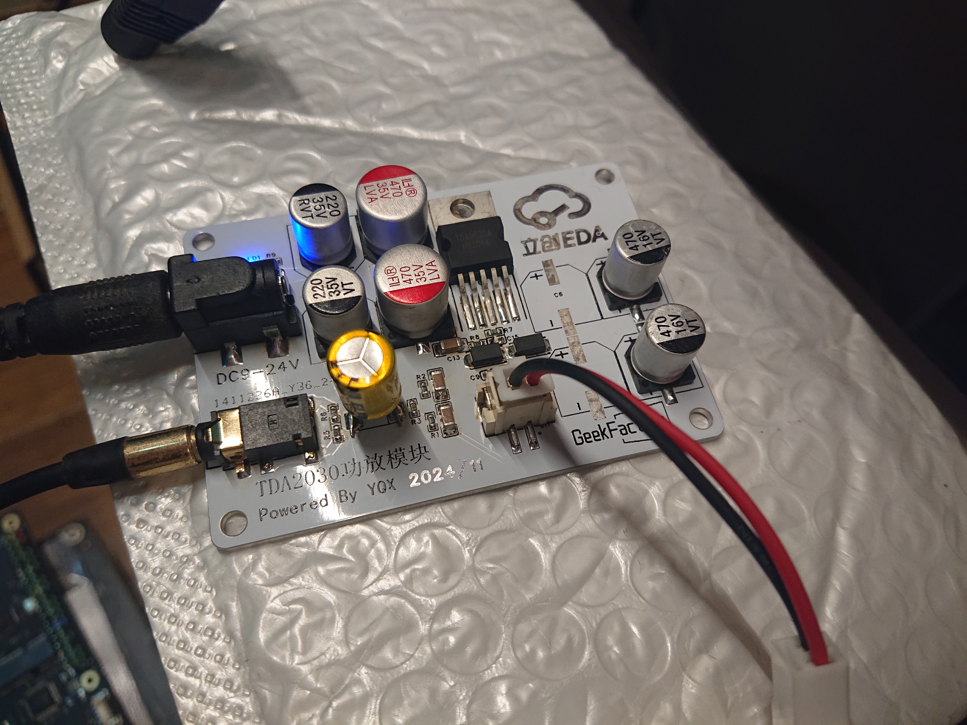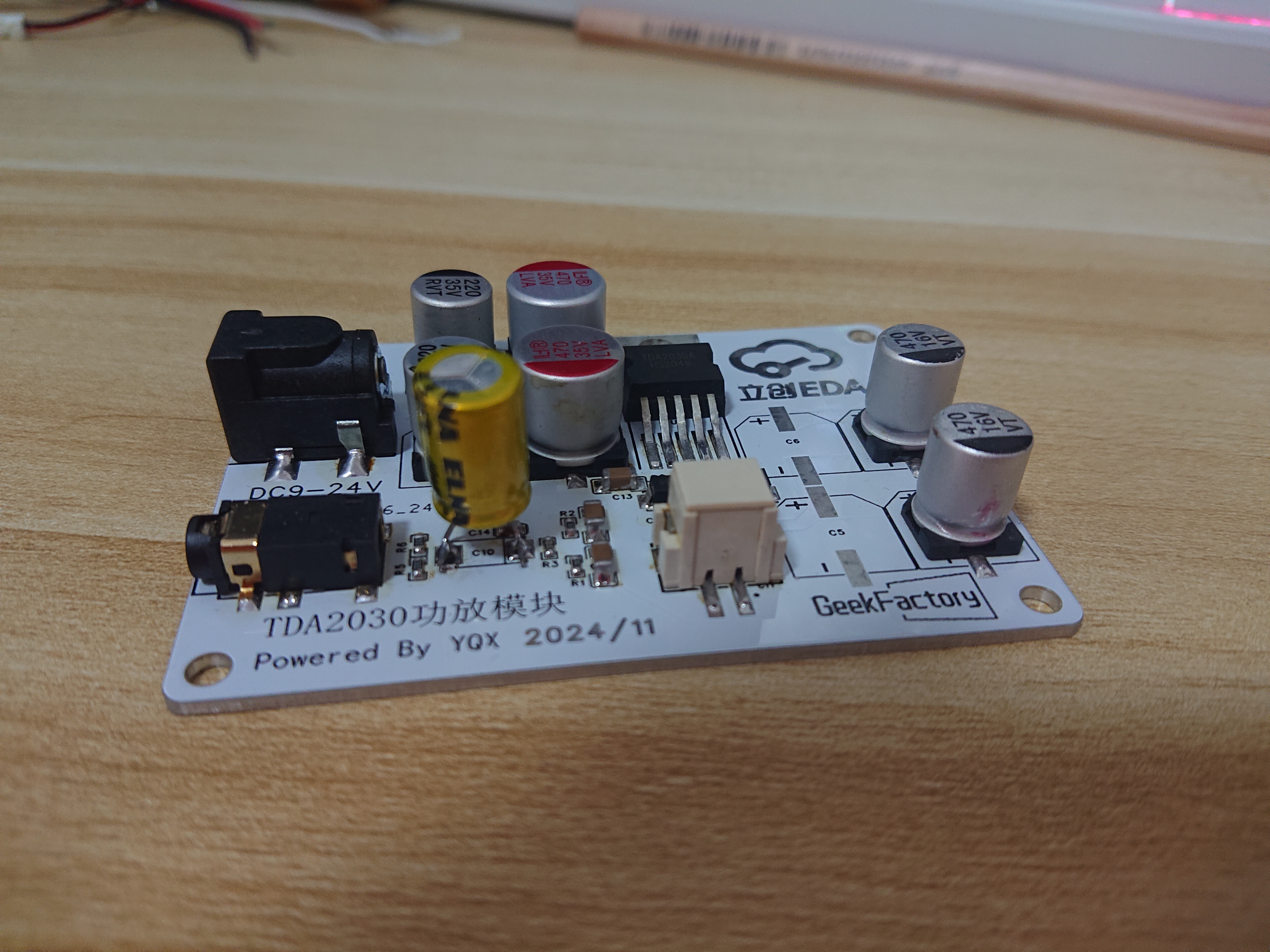 再说一下细节,C15电容是验证电路时加的,后面实测不需要贴,然后C14电容是纯重低音输出的(低频滤波),接低音炮就接上,需要全频就不贴。我的测试板是贴了C14的,接的6.5寸低音箱测试。输出是XH2.54接口,这个接口一般不会用在音箱上,所以线需要自己改一下。