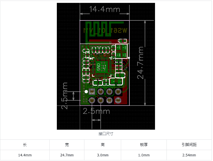 NearLink-01S 贴片式模组的外观尺寸为14.4mm*24.7mm*3.0mm。模组使用的是3DBi 的PCB 板载天线。