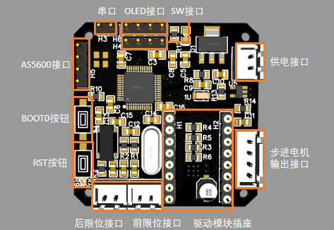*USART接口*1、SWD调试接口*1、IIC OLED显示屏接口*1、IIC AS5600接口*1;限位接口:外部触发中断;