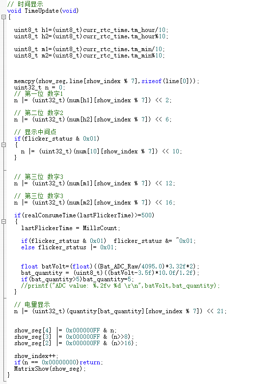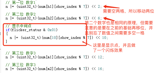 接着又得说一个让人迷糊的事情了,就是显示的移位顺序。当前左侧一个在电路图中正是按上面的标号 0-9,第二个屏标号应该是 11-21,也就是说左侧是从低到高。不知道能不理解,而每个数字是占三列的,哪么实际显示数字1的列应该是第2 、3、 4列,左侧是有空两格的,这主要是为了让时间显示时更居中一些,这里显示即然是左侧空了两格,自然就需要将第一个数字移动两格,所以我们看到代码中有移位的操作,请看下图: