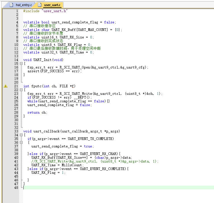 UART主要用于调试信息的打印,这里得说下,虽然瑞萨的配置比较方便,但对底层配置搞不太明白,但的确是非常的方便,比如串口配置,在FSP中配置完成后,就直接使用对应的Open函数就可以了。