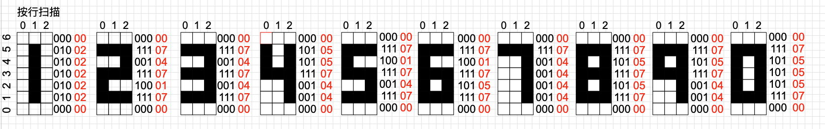 所以下面就按行扫描形式进行输出需要的内容的方式,我们这里有7个阴极,我们将阴极做为行,一行一行的去显示。我们还是按显示数字2来讲解,我们从上而下的来讲解,哪么第0行置为低,其他行都为高,接着0-10列因为都没有内容所以都输出低电平,接下往下一行 第1行输出低电平,其他输出高电平,需要将 3、6、7、8列输出高电平。以此类推,每扫描到一个新的行时,把对应列中需要显示的位置置为高电平即可,这样一行一行往下进行扫描,就能实现所需内容的显示了。下图就是按行扫描时需要输出的内容(需要注意的是我这里低位在左侧),我们每个数字分成7行,每一行转换为需要的数字,之后我们在显示时仅需要将所扫描到的行上的每个数字所对应的行的数字进行移位,然后发送出去就可以了。