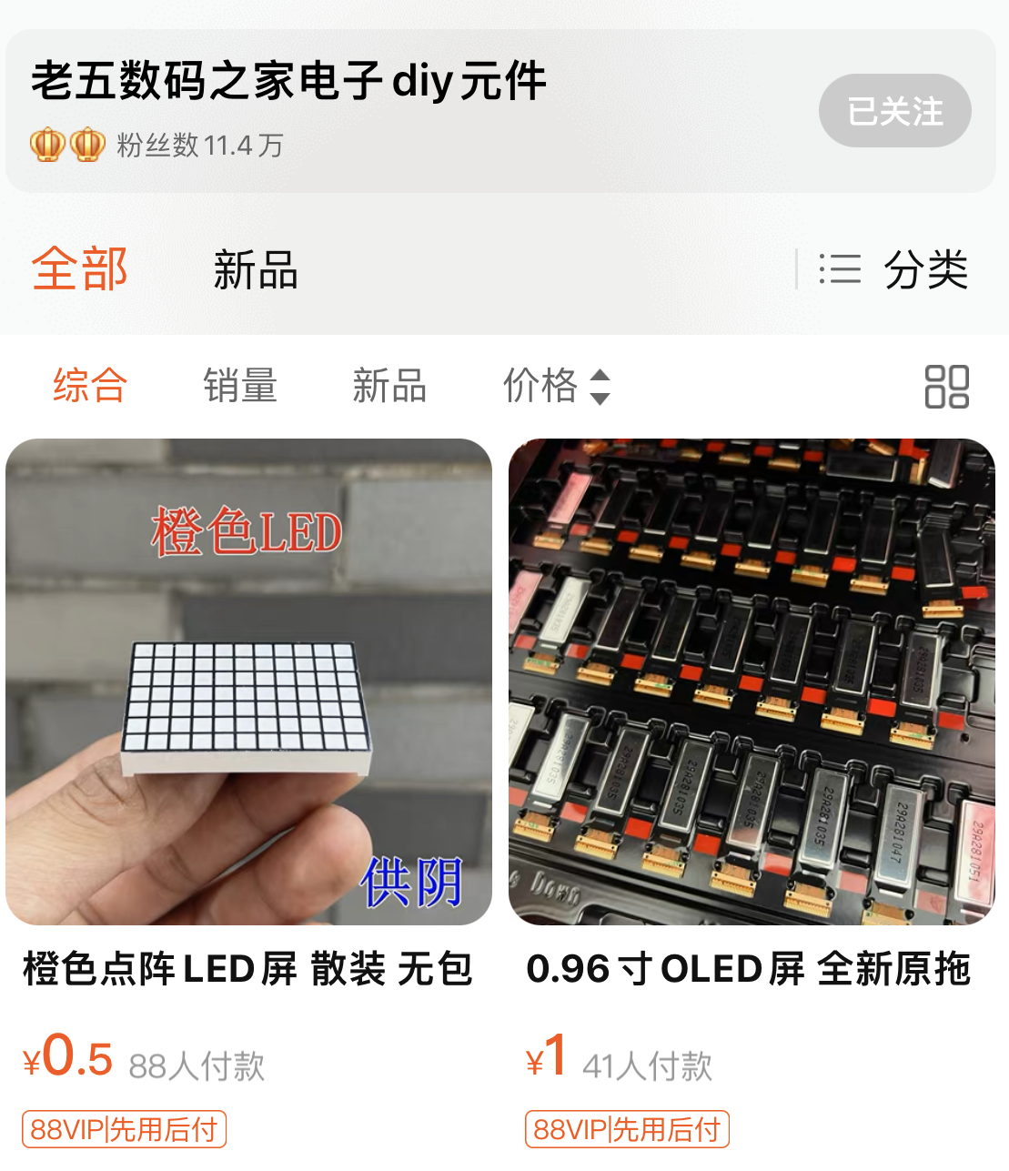 这里用到的点阵屏是某宝去老五家的橙色点阵屏,价格也不贵 0.5元一个,11*7分辨率,个人感觉还是挺划算的,有兴趣可以去看看。