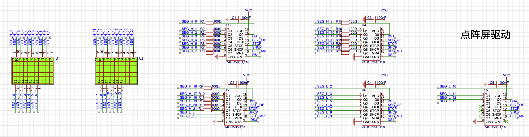 我这里用了5块74HC595,这样就有了40个IO口了,而实际上我仅需要36个,所以就有四个空闲了。图中U3-U7就是5块移位寄存器,我们将U7做为高位,U3做为低位,这个点阵屏的11针哪排为阳极,7 针哪端为阴极,如果我们将11针全加高电平,7脚全部为低电平,哪则会全亮。当前设计的是高14位连接阴极(除空闲的四个外),低22 位连接到阳极端,这样我们就只需要按需输出高低电平就能实现显示了。